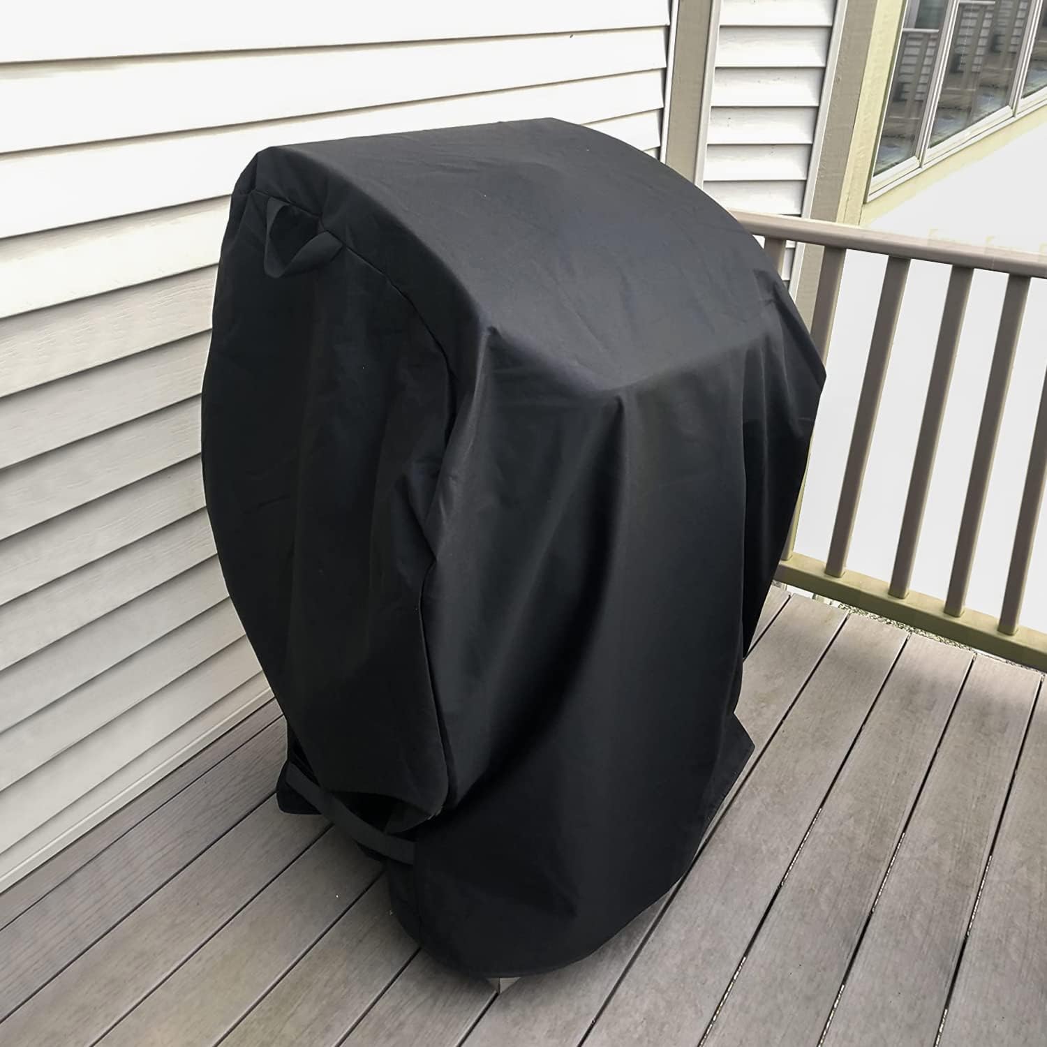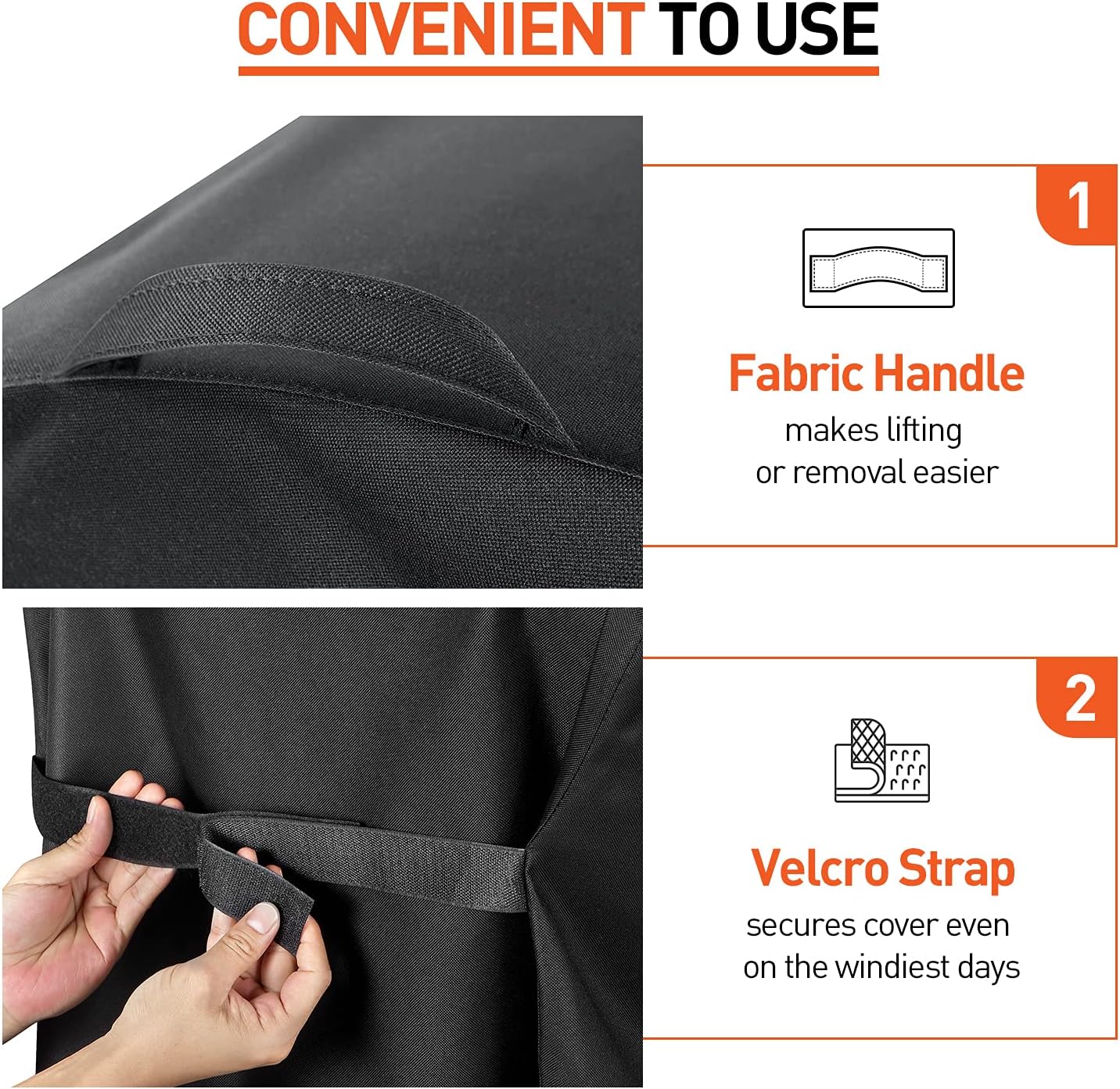 - HANDLES AND VELCRO STRAPS - Two handles on the top of the small grill cover help to cover or remove easily. It can also be used for hanging and storage. The additional velcro straps on both sides ensure the tightness of the cover and keep it in place, so the cover won't be blown away even by strong wind.