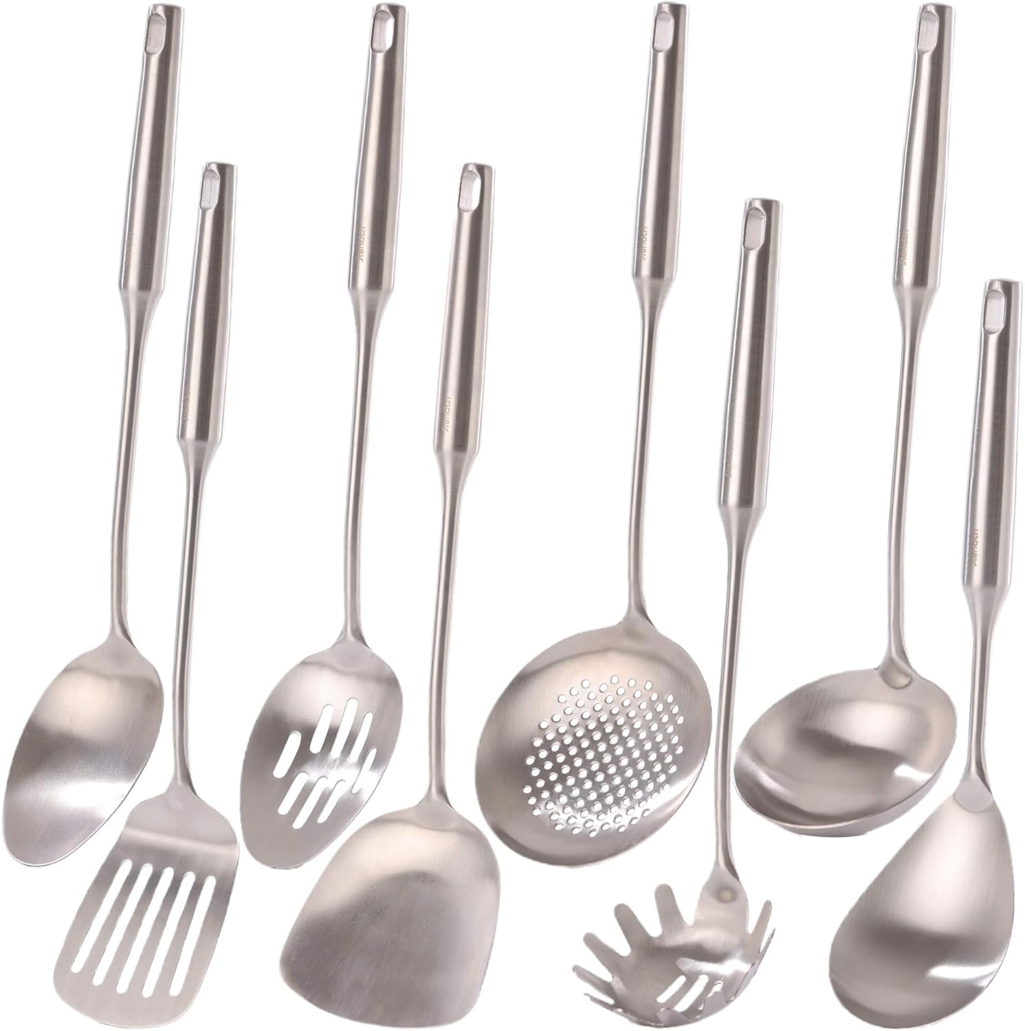 - 【High Quality Kitchen Utensils Set of 8】: Made of restaurant-quality 18/10 stainless steel(Highest grade in 304). Forged in one-piece with no welding or stress points, sturdy and durable. Fine matte brushed, unique shape and style