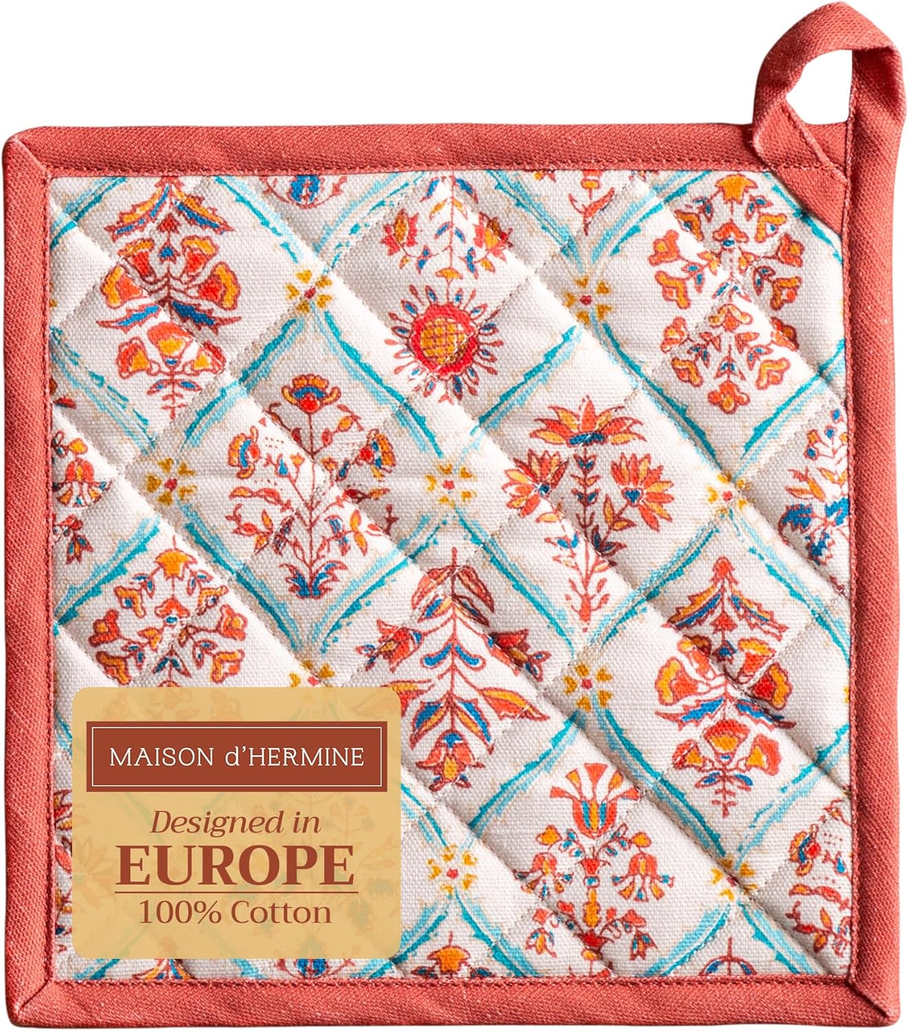 Maison d' Hermine Pot Holders 100% Cotton Heat Resistant Potholders 8" x 8" Hot Pads with Loop BBQ, Cooking, Baking, Grilling, Kitchen, Handling Hot Pans (Pack of 1, Romane)