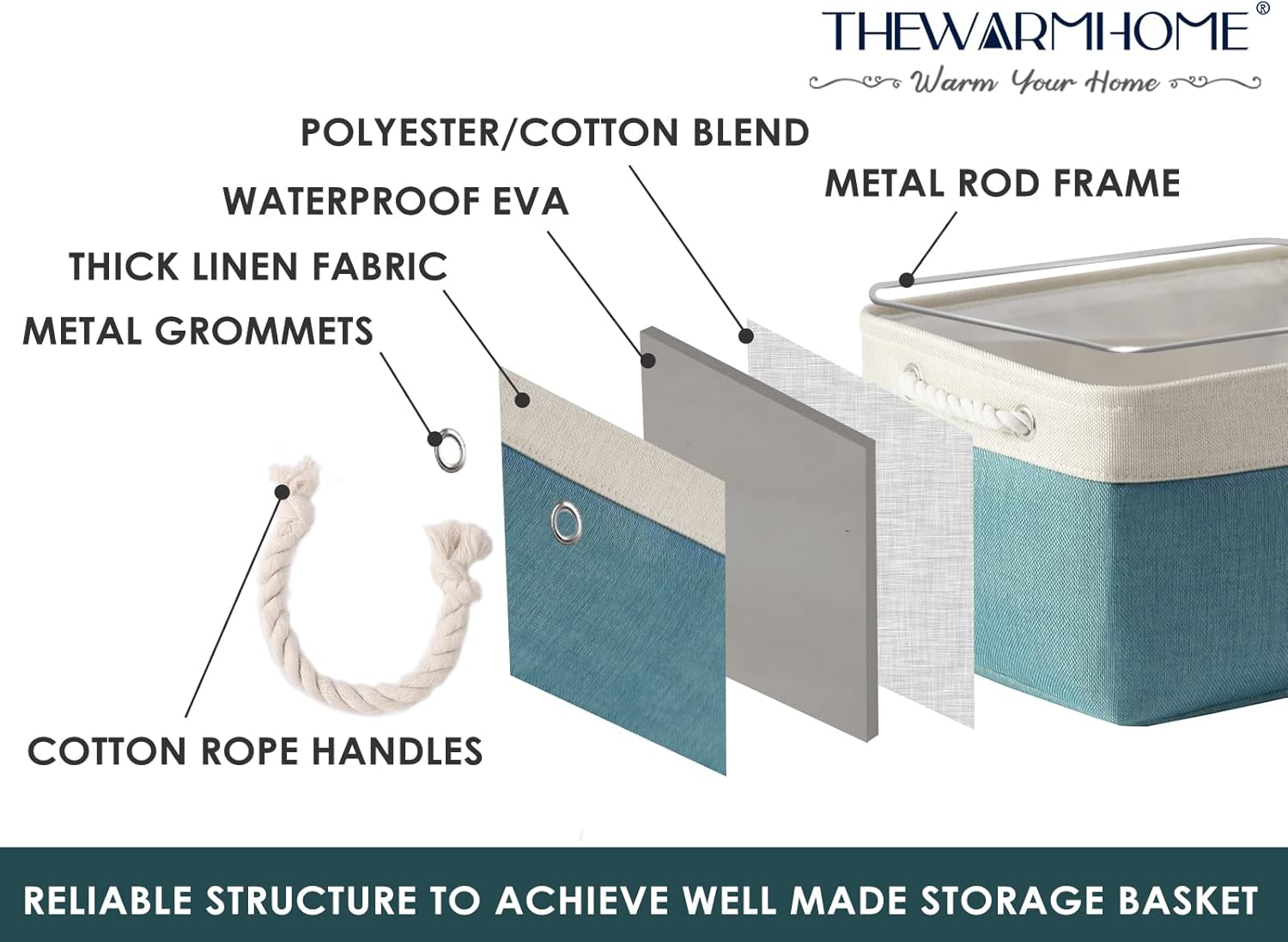- HANDMADE STICHED & STURDY - TheWarmHome fabric storage bins outside fabric is made of more linen & thicken Environmental EVA, and used a lining material for the inside, Semi handmade stitched. Sturdy metal rod frame around the top keep the basket shape. Strong seams and rope side handles, make this storage baskets are sturdy and easy to grab. Stand up great on their own even unfilled and ensure a greater product lifespan.