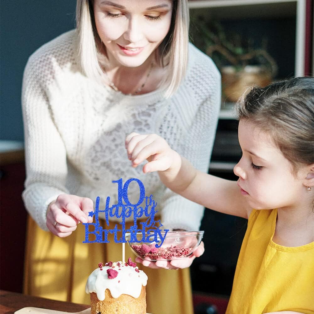 Glittery 10th Cake Topper with Star Boys and Girls 10th Birthday Party Supplies, Ten Years Old Birthday Party Decorations Royal Blue