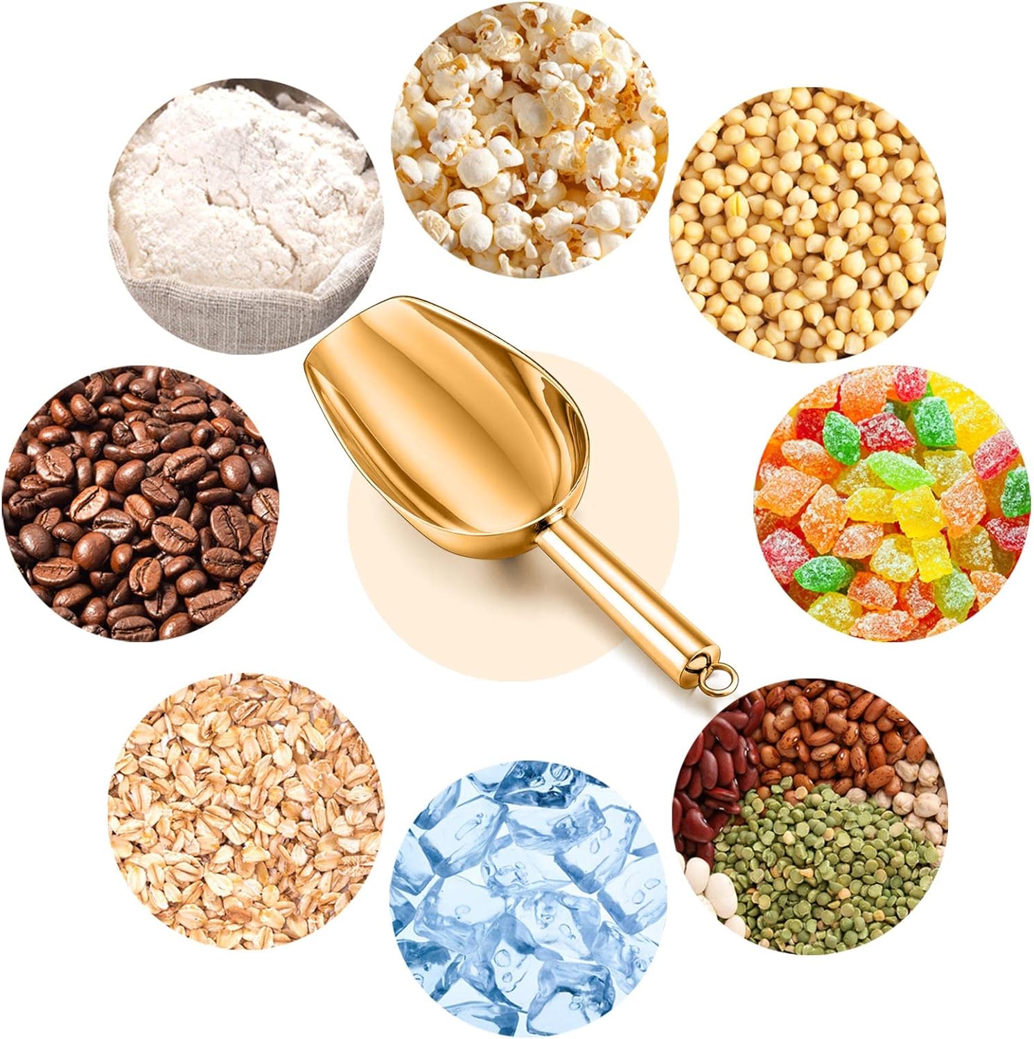 - Versatile: 5 oz capacity metal ice scoop Overall length 8 inch, Bowl 4.5’’ L x 2.7’’ W x 1.5’’ H, Ideal for scooping ice cubes, candy, coffee beans, flour, Also could be used as dog cat food scoop, Meet all your requirements