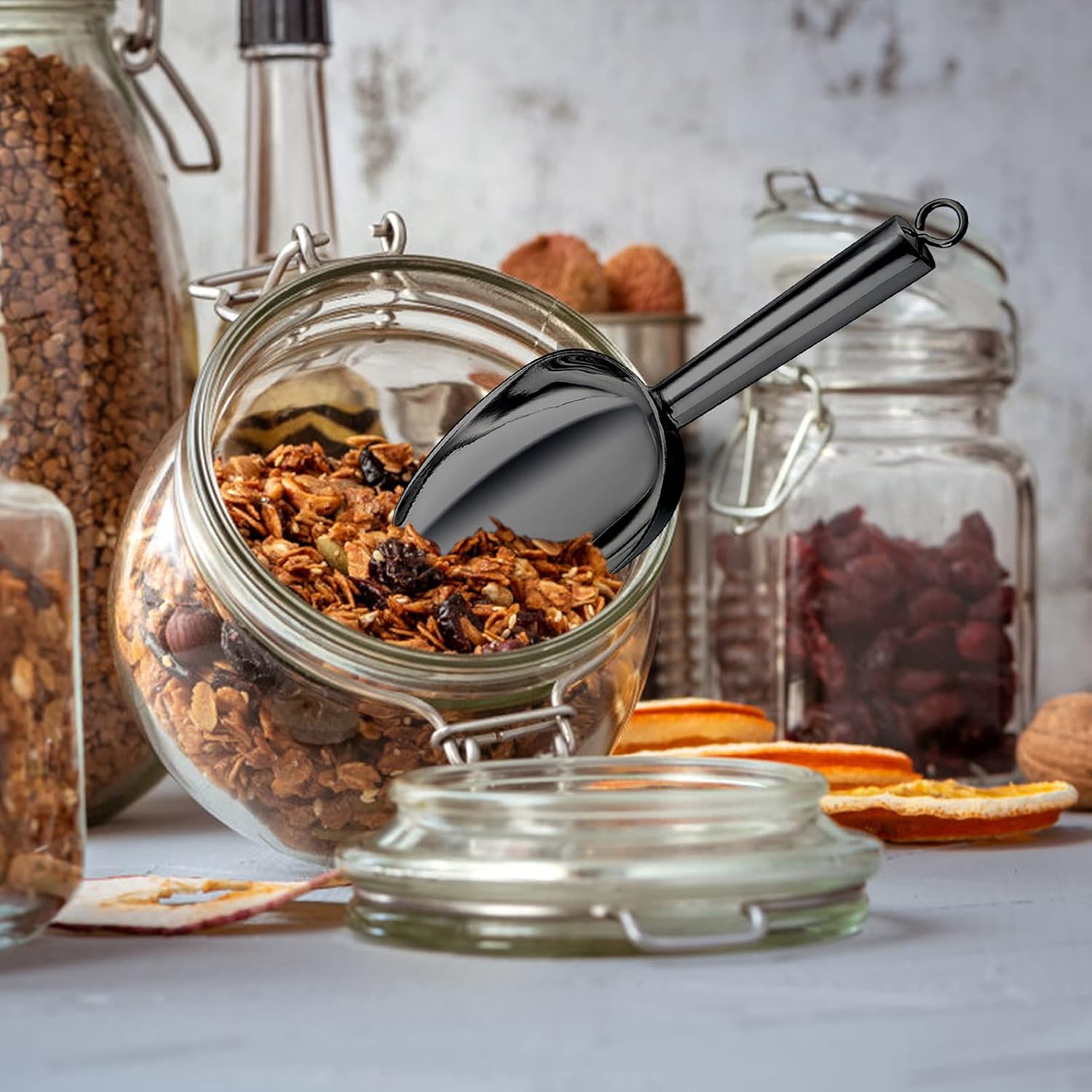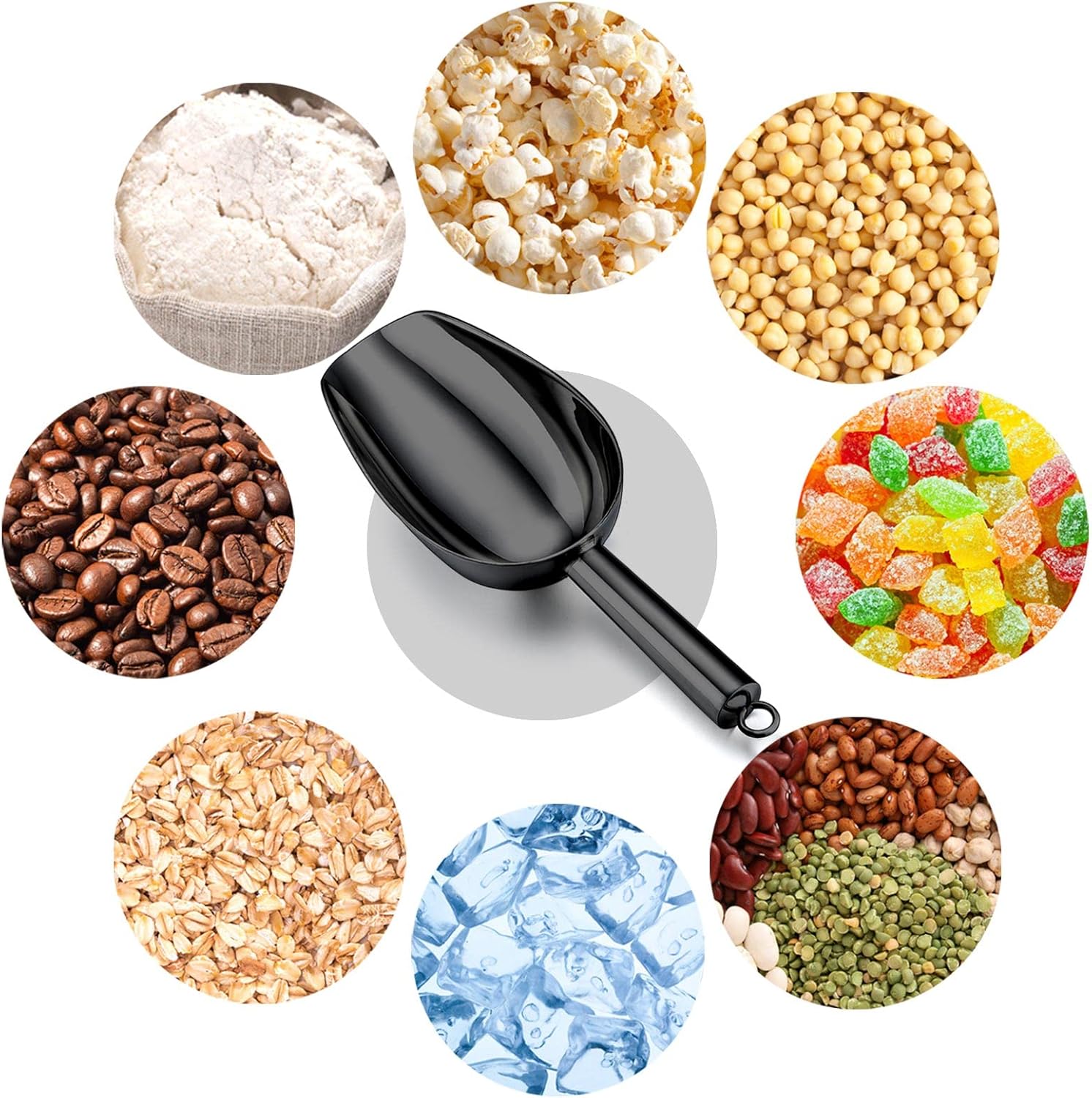 - Versatile: 5 oz capacity metal ice scoop Overall length 8 inch, Bowl 4.5’’ L x 2.7’’ W x 1.5’’ H, Ideal for scooping ice cubes, candy, coffee beans, flour, Also could be used as dog cat food scoop, Meet all your requirements