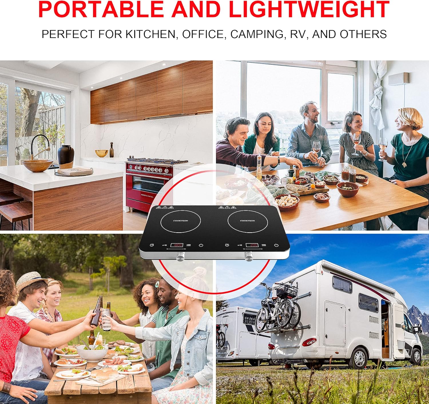 - 𝐑𝐀𝐏𝐈𝐃 𝐇𝐈𝐆𝐇 𝐏𝐎𝐖𝐄𝐑 𝐈𝐍𝐃𝐔𝐂𝐓𝐈𝐎𝐍 𝐂𝐎𝐎𝐊𝐓𝐎𝐏:1800w quick heating double induction cooktop is faster than a standard double induction burner. Compared with traditional induction stove, it has a higher heat conduction effect, which meets various cooking needs, such as steaming, boiling, fried, frying, slow stewing. Through the knob operation, we can control the heat more accurately, and the ventilation duct design can better dissipate heat and prevent damage to the countertop.