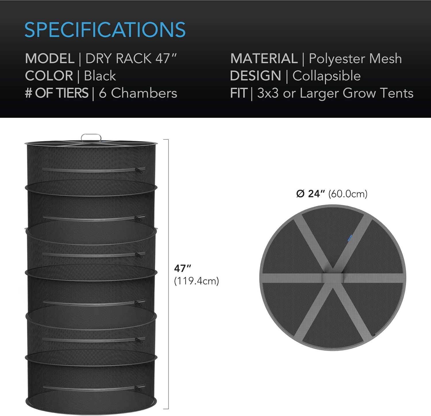 - 6 Tiers | 24 in. Diameter | Fits 3x3 or Larger Grow Tents | Includes Hanging Hook & Carrying Bag