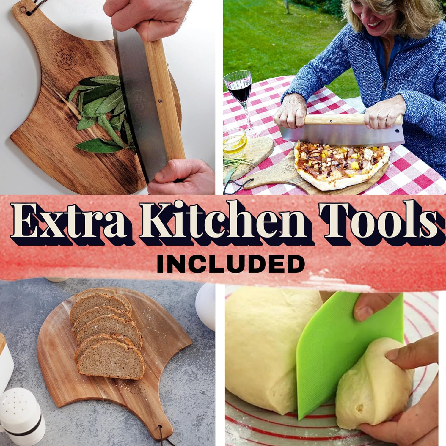 - COMPLETE 5-PIECE PIZZA MAKING SET: Includes everything you need - durable pizza stone with removable stainless steel handles, acacia wood pizza peel, stainless steel pizza cutter with comfort wooden handle and blade cover, recipe ebook, and dough tool scraper. Essential tools for both beginners and experienced pizza makers