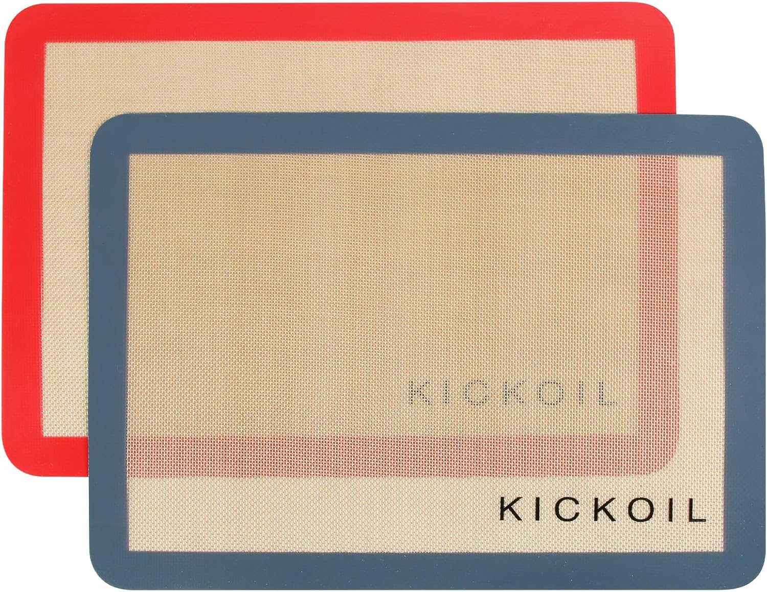 - Economical Silicone Baking Mats Sheets: Whatever you're baking or cooking, slide a KICKOIL cooking sheet onto the tray & bake with confidence. Its non stick surface attribute eliminates the need for oil,spray,butter,grease or parchment paper aluminum foil. Baking mats for cookie sheets are perfect for half sheet pans. The non-stick backing pads are an baking tool and accessories in your flat, apartment, lodging house,bakery or RV