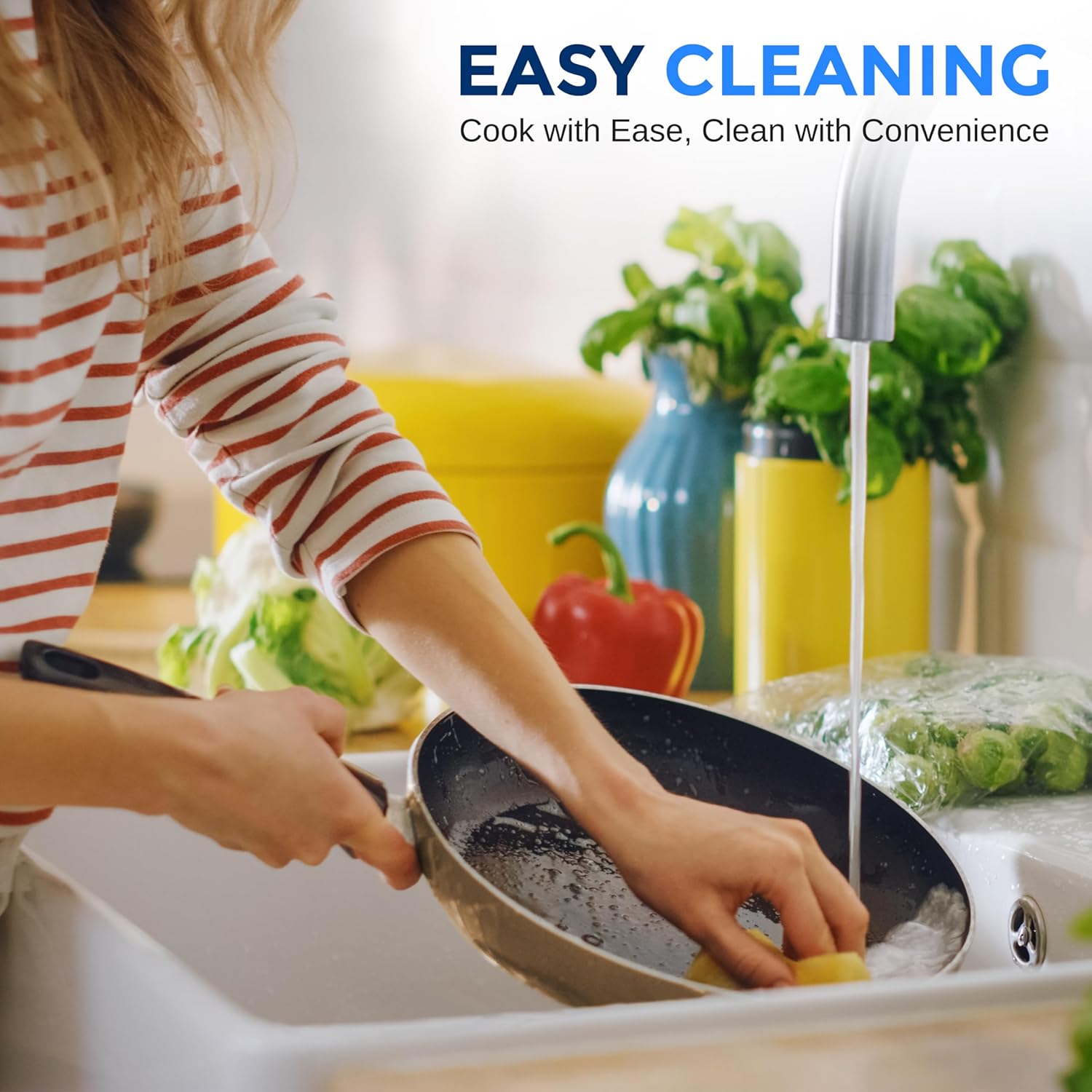 - NON-STICK COATING: The PFOA/PFOS-free non stick pot set cooking ware features a long lasting nonstick coating for easy food release or tossing, cleaning & healthy cooking w/ heat resistant lacquer exterior making it resistant to high heat