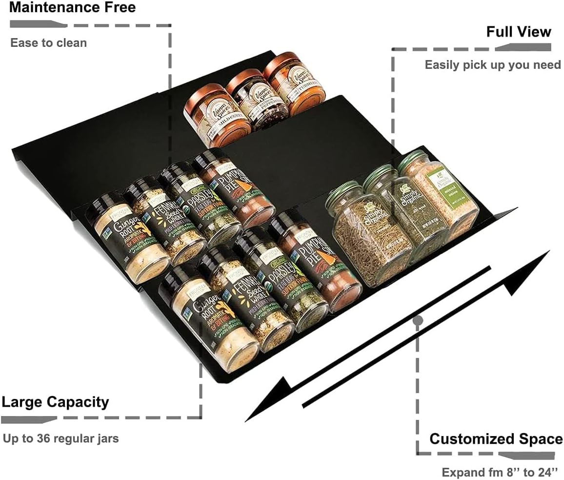 - Expand to Customize the Fit Size - The spice drawer organizer features of being expandable and adjustable. Each spice drawer organizer insert measures 4.7 W * 8 L * 1.1 H inches, Expands from 8" to 16" wide. All you have to do is simply set it down and expand it top whatever size suits your best for a customized organizer. Large capacity up to total 30 regular spice jars.