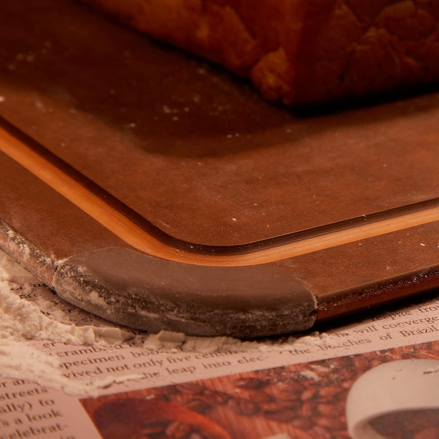 - 14.6"L x 10.8"W x 0.24"Th cutting board with non-slip feet and nutmeg colored juice groove; brown silicone feet