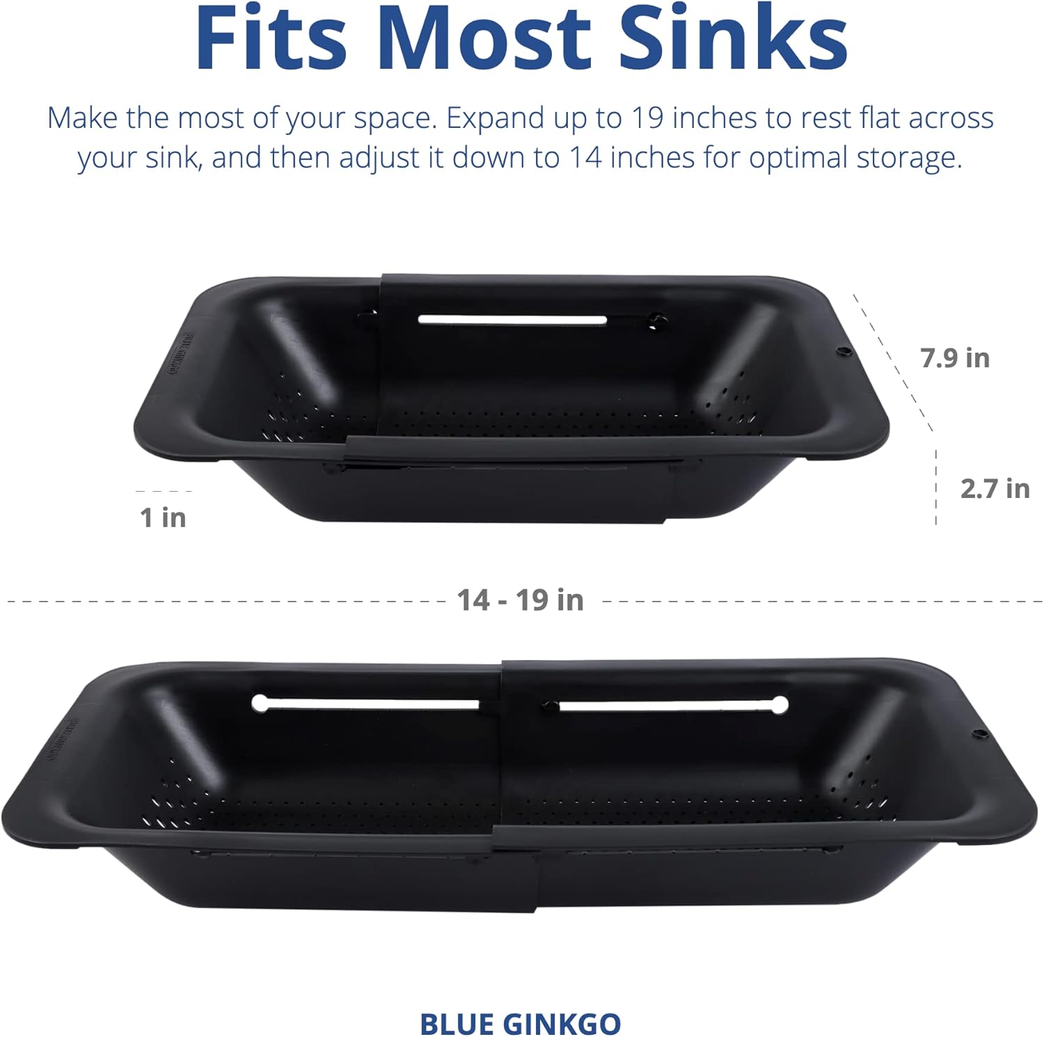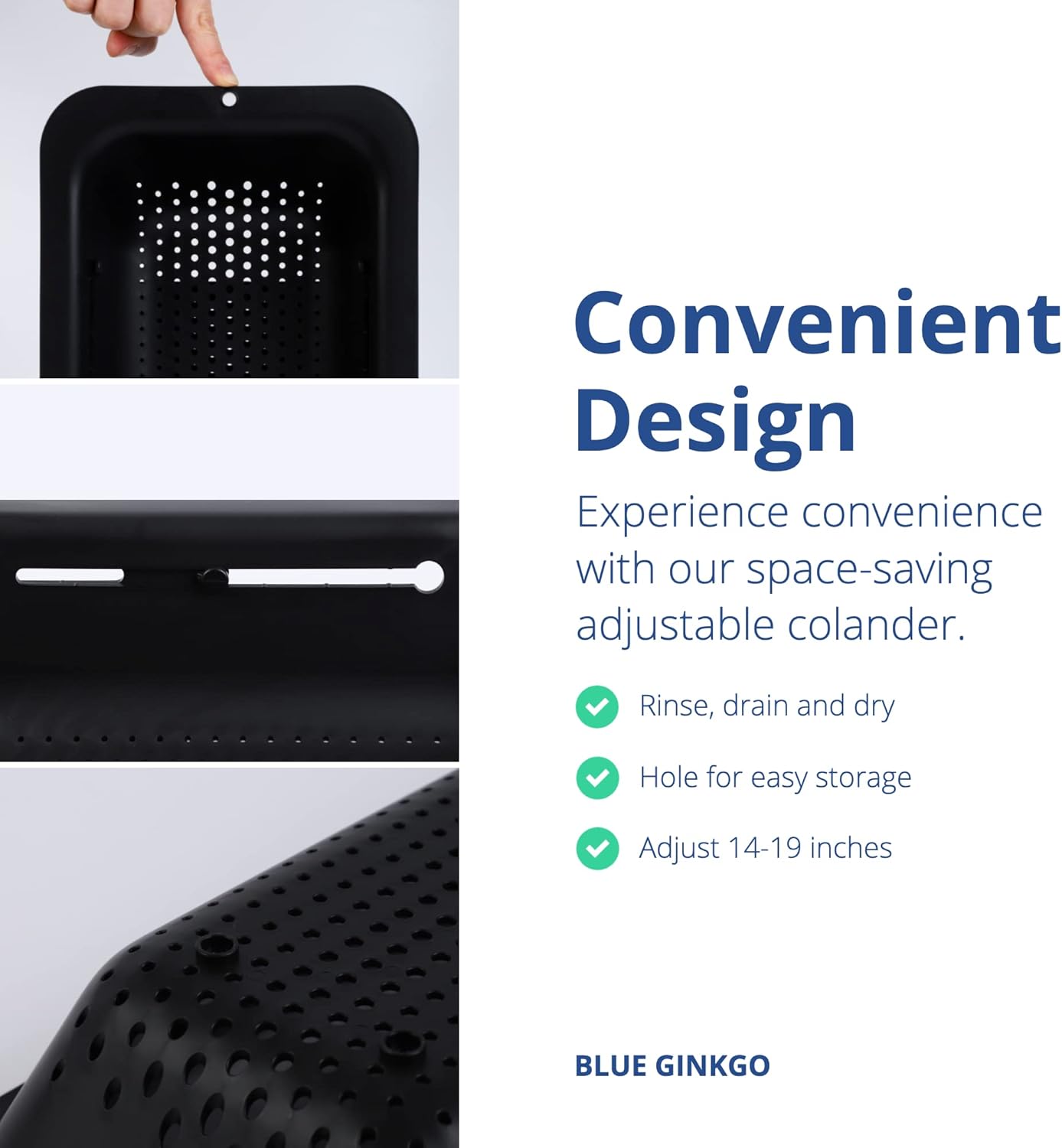 BLUE GINKGO Over the Sink Colander Strainer Basket - Wash Vegetables and Fruits, Drain Cooked Pasta and Dry Dishes - Extendable - New Home Kitchen Essentials - Black