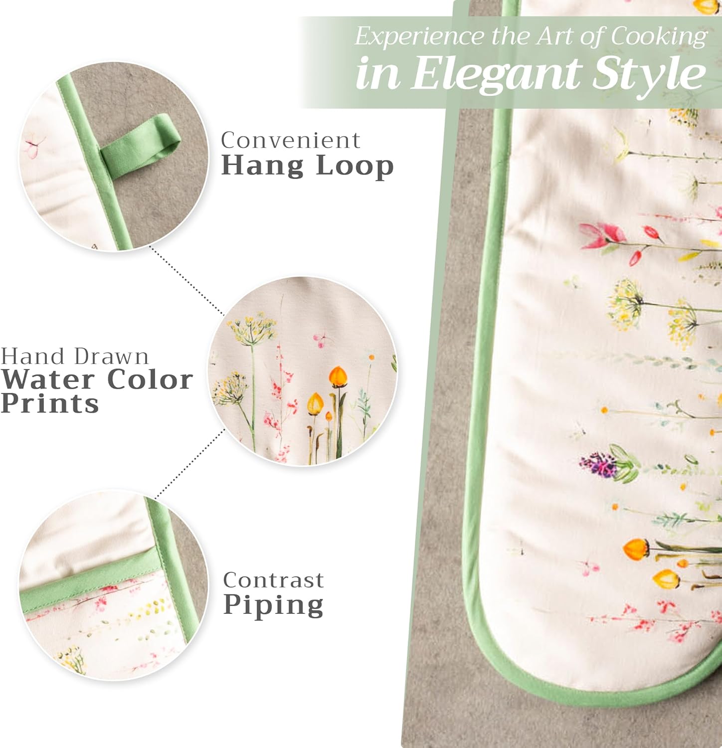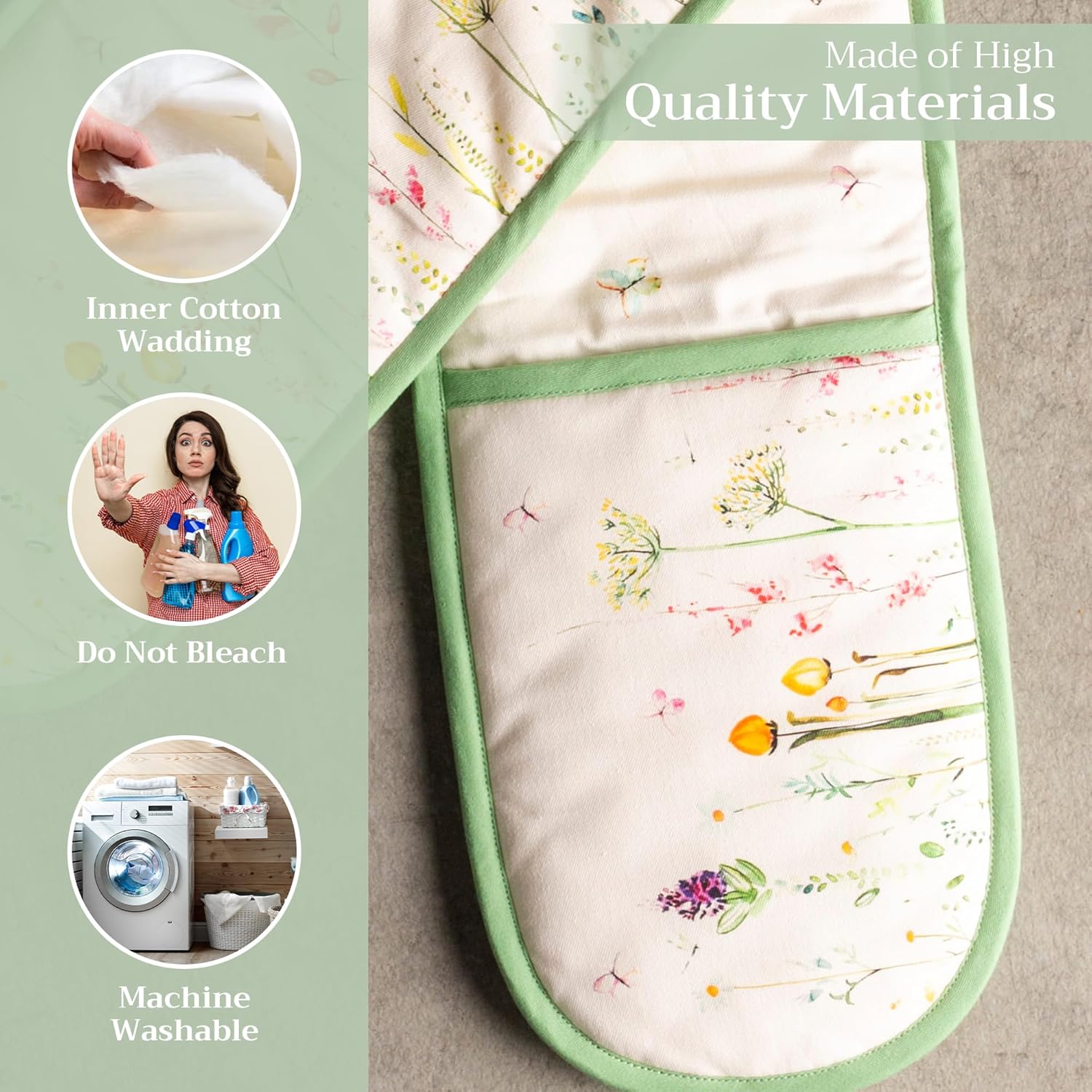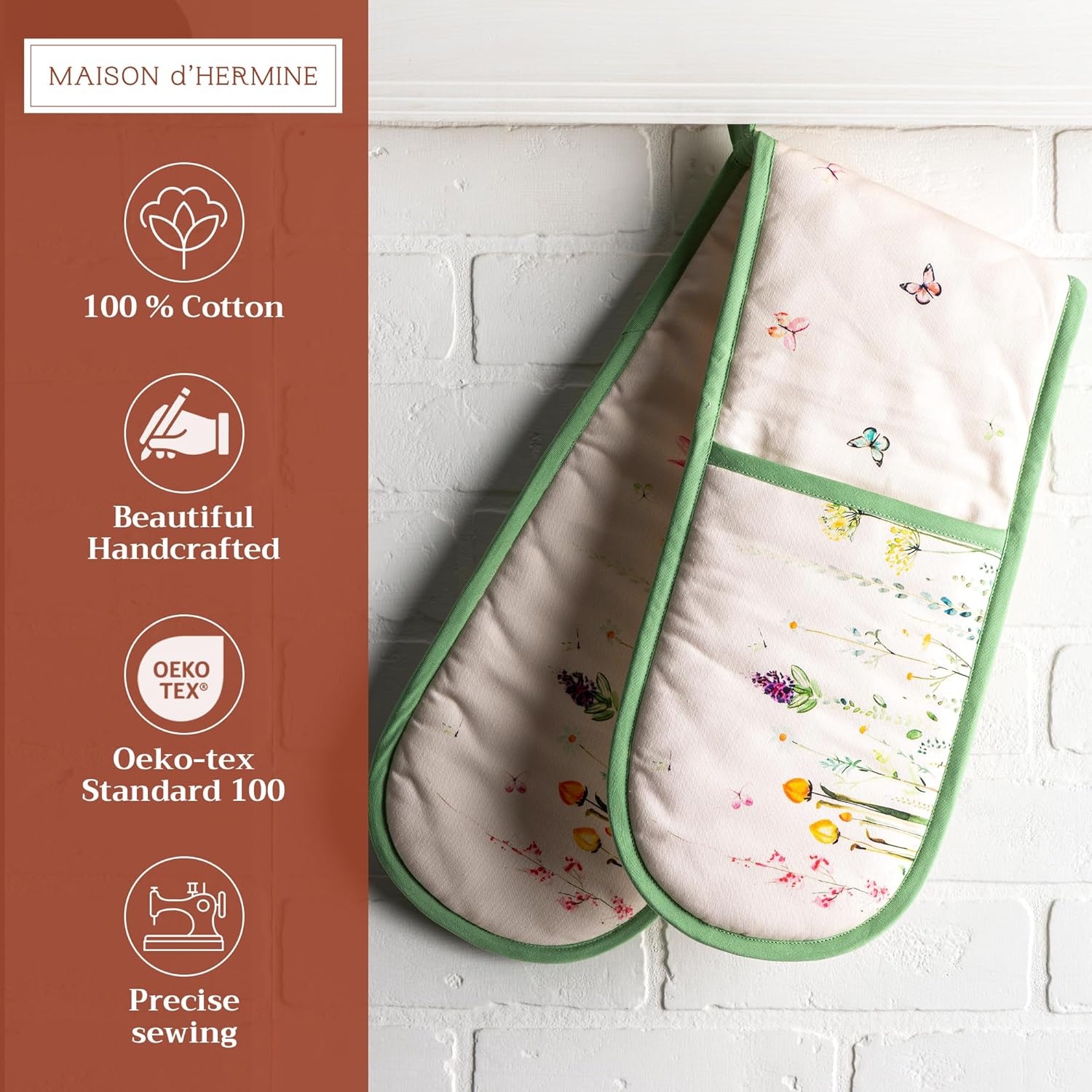 Maison d' Hermine Double Oven Mitts 100% Cotton 7"x35" Double Oven Mitt Heat Resistant BBQ Cooking Gloves with Loop, Baking, Grilling, Home, Kitchen, Handling Hot Pans Spring Summer (Botanical Fresh)