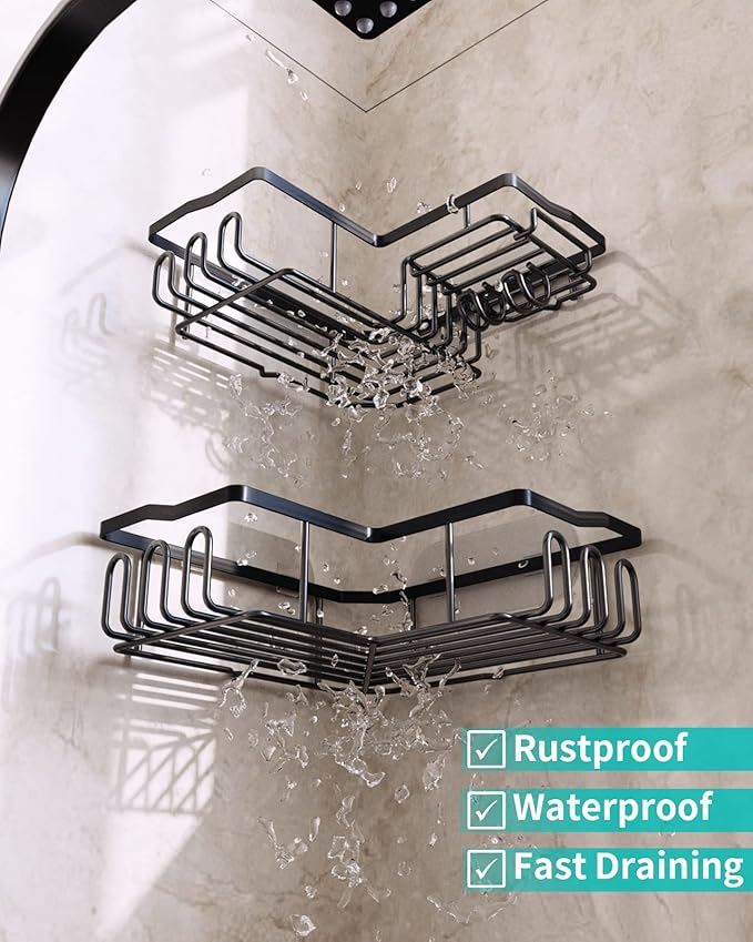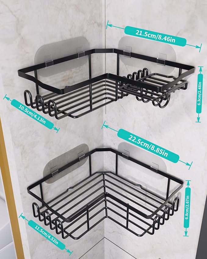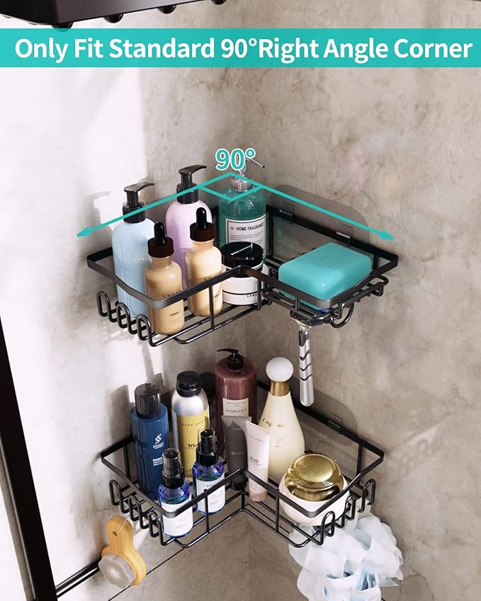 - [Large Capacity]: L-shaped corner shower shelf, only suitable for 90° corners. Black shower caddy perfectly matches all bathroom decoration styles, 2 tier shower organizer with 11 hooks and shampoo holder, provides enough space to storage daily products