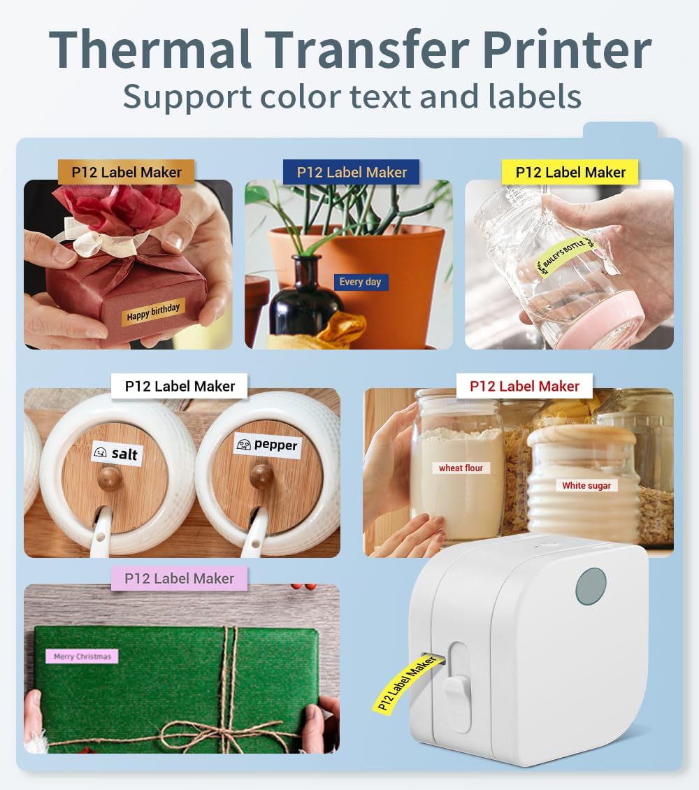 - Dual Printing Technology: Bluetooth label maker uses BPA-free thermal technology and thermal transfer printing technology, wireless label maker is equipped with 203 DPI high resolution, no need for ink or toner to enjoy high-definition printing effect. The use of P12 labels waterproof, oil-proof, scratch-proof, tear-proof, no residue after tearing off, ribbon label maker can also print text on the ribbon, ideal for crafts flower wrapping, cake labels, greeting card labels