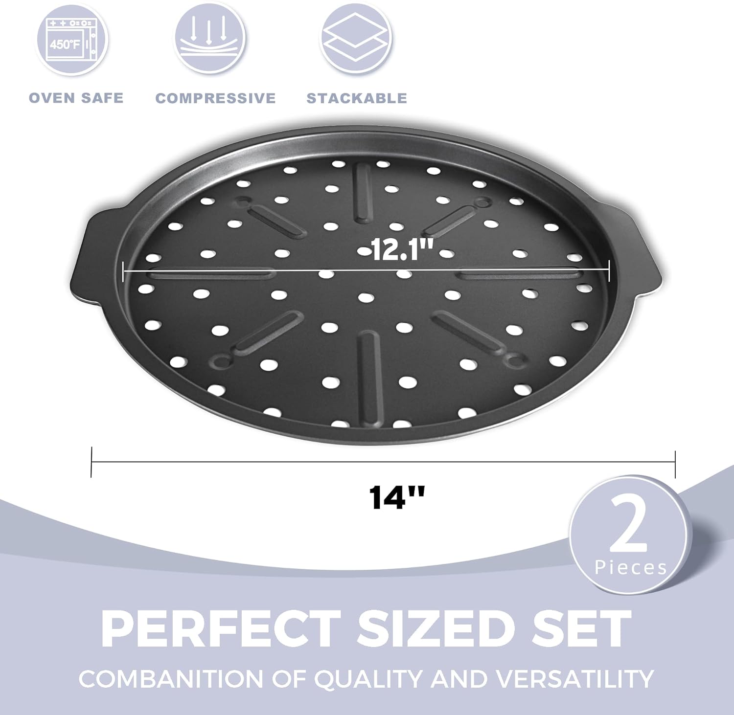 - MULTI-FUNCTIONAL - These pizza oven pans have external dimensions of 14.2 inches and internal dimensions of 12.2 inches. These pizza crust pans with sides are suitable for all kinds of ovens. In addition, the bottom of the pan has several perforated nibs that raise the pizza above any grease and prevent the crust from getting soggy