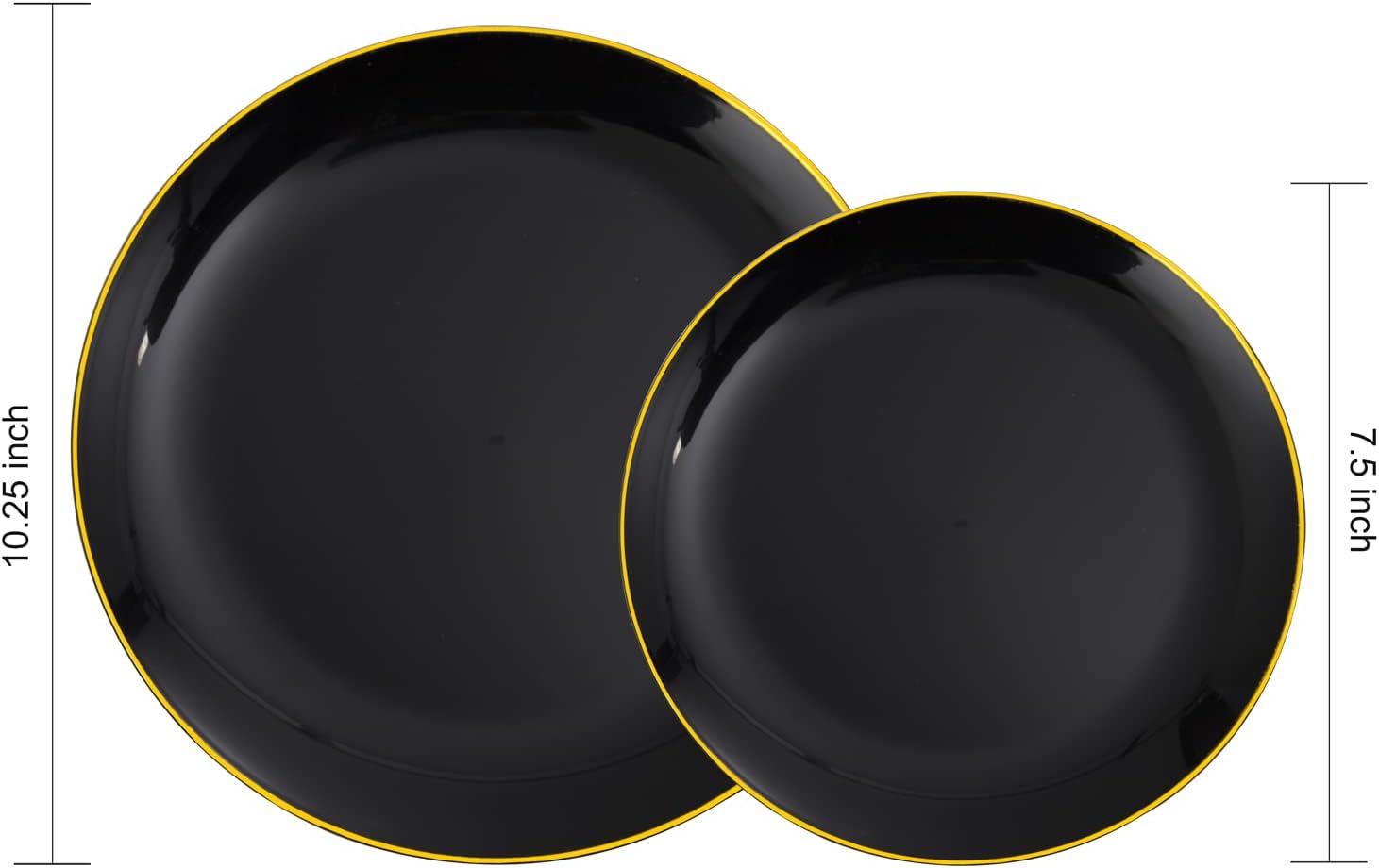 - WELL-DESIGN - These black plastic plates with gold rim are very elegant and can make your party look more youthful and energetic. The gold rimmed design increases the touch feel of the plastic plates and enhances the use of the party plates