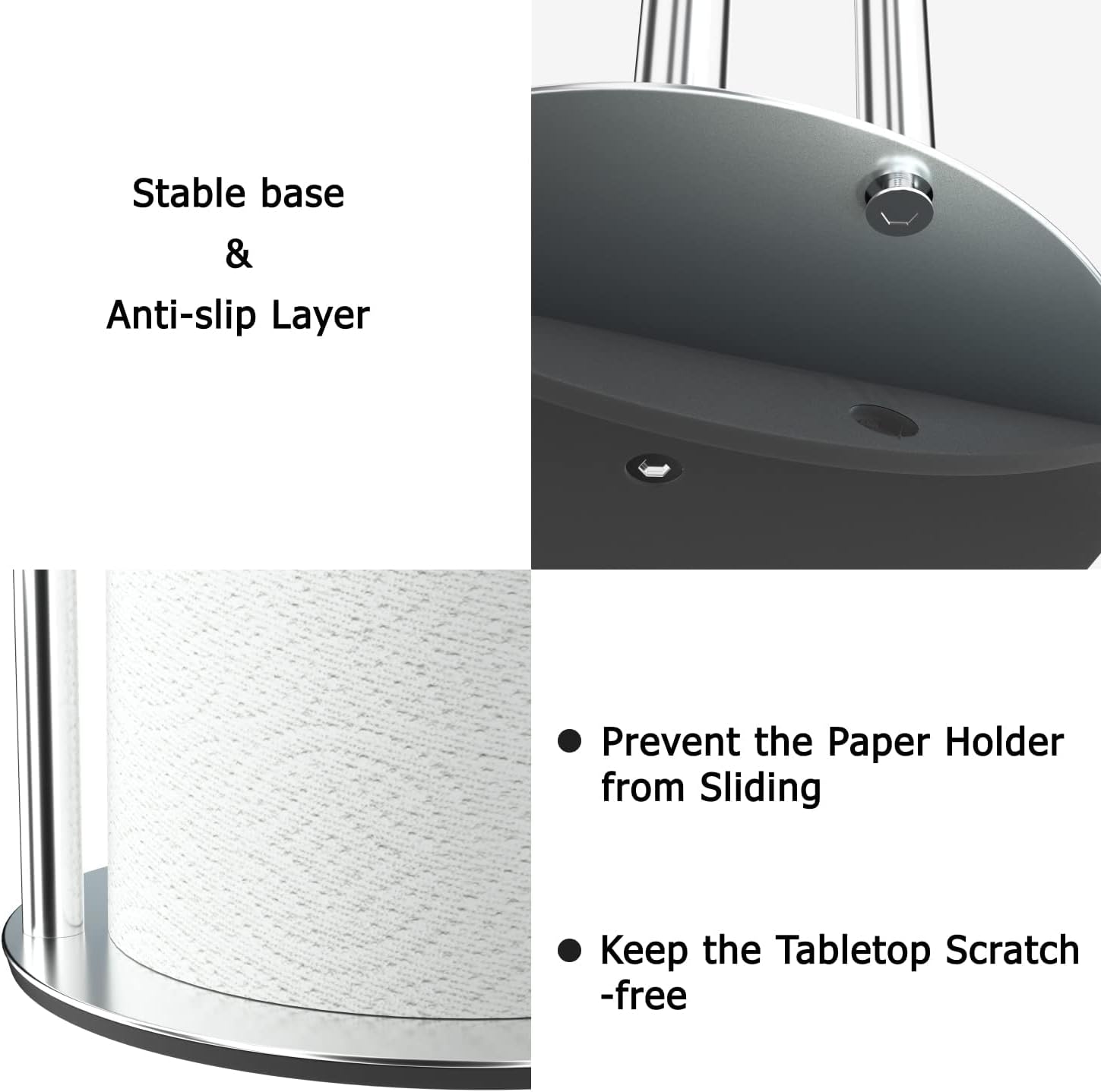 - Stable Base: The paper towel holder has a weighted base, can help you one hand-operate easily, and a non-slip silicone pad is added on the bottom to stay the paper towel holder in place when you are tearing paper sheets. It also prevents the mental scratching of your countertop.