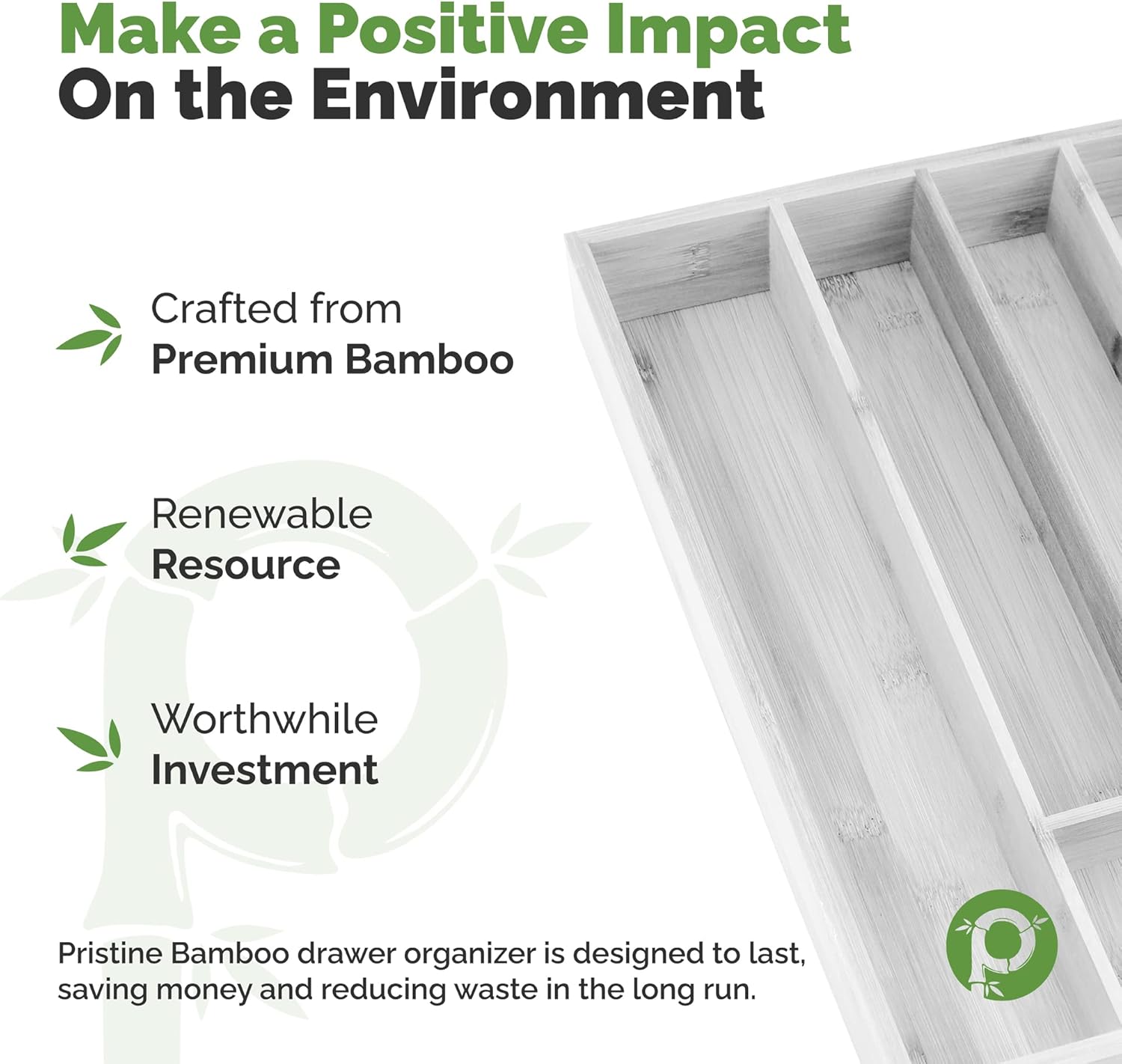 - MULTIPURPOSE USE: You can use the Pristine Bamboo silverware drawer organizer tray for many things! It would be perfect in your bedroom or bathroom. You might want to put all of those extra items that are just taking up space into an organized system instead—like Flatware, Utensils, Jewelry, Silverware, and makeup...the possibilities seem endless when you think about how much easier everything will become with Pristine Bamboo :)