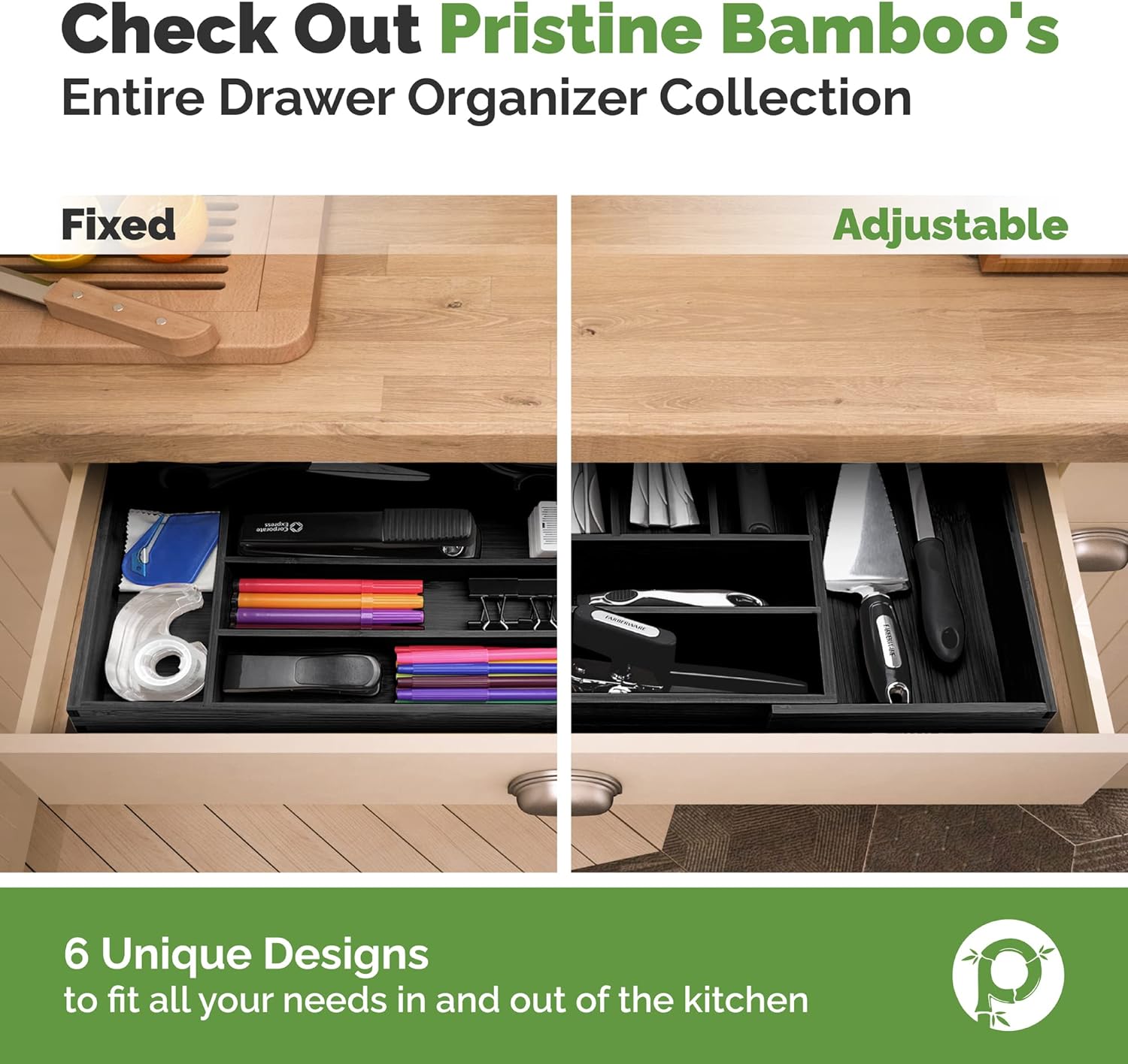 - STORAGE SPACE PROBLEMS SOLVED: Why not use the space in your kitchen drawers to store all those utensils? With Pristine Bamboo sleek, stylish kitchen utensil organizer for drawers, you'll be able to put away larger tools like spatulas and whisks while still having plenty left over for smaller gadgets.