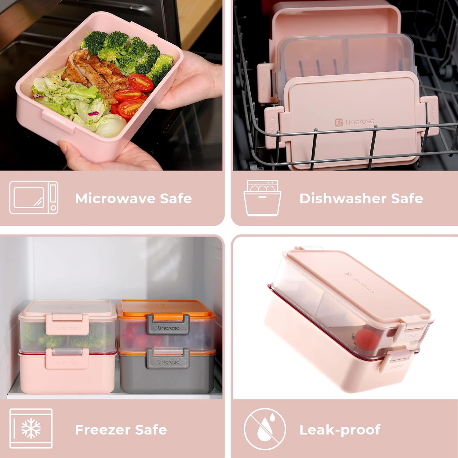 - Compact and Easy Storage: This bento boxes are leak-proof and dishwasher, freezer, and microwave-safe. The top container features 3 compartments. It's specially designed to keep the food separate. Whether it's fruits, vegetables, proteins, etc, you can easily contain different kinds of foods in certain quantities and proportions