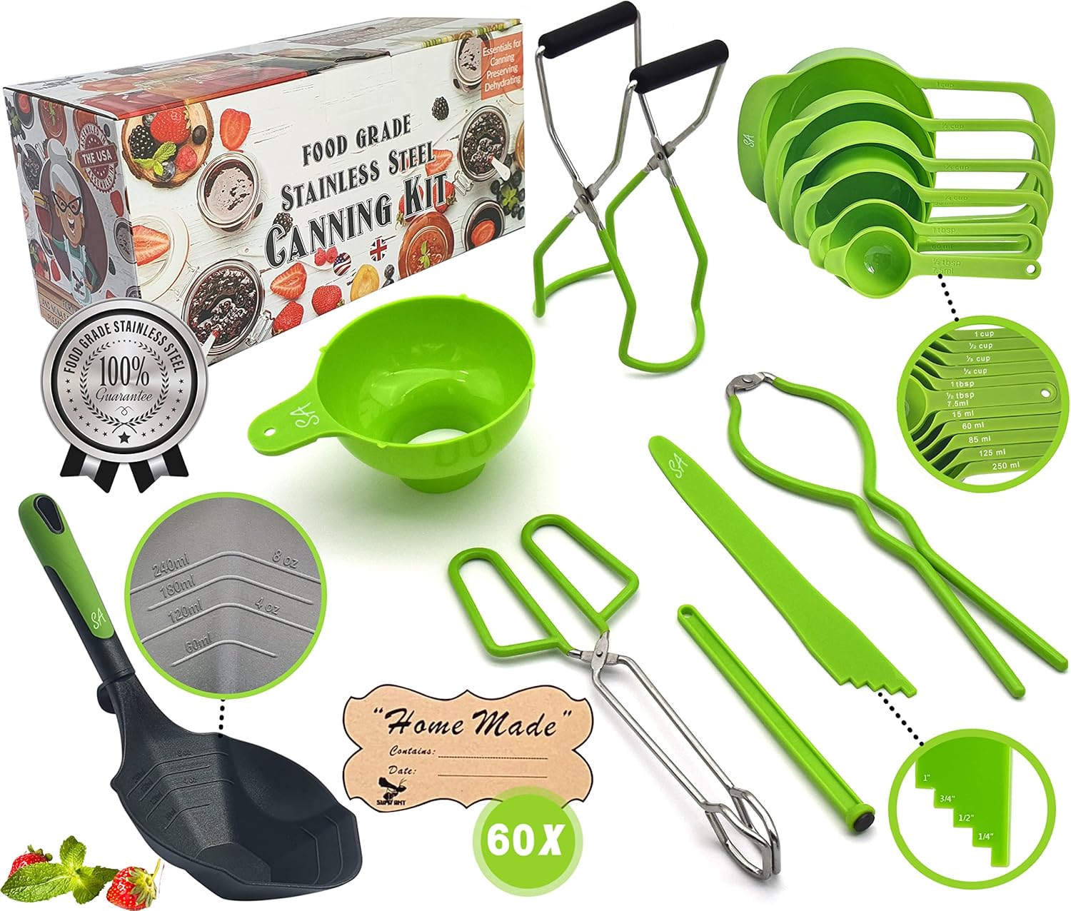 - All-in-one canning supplies - This home canning kit consists of all essential tools: canning funnel, jar lifter, bubble popper (measurer), magnetic lid lifter, jar wrench, canning tongs, large canning scoop (More than ½ Pint), 6 measuring cups and a set of "Homemade" labels to remind everyone of the hard work you have put in to make it :)