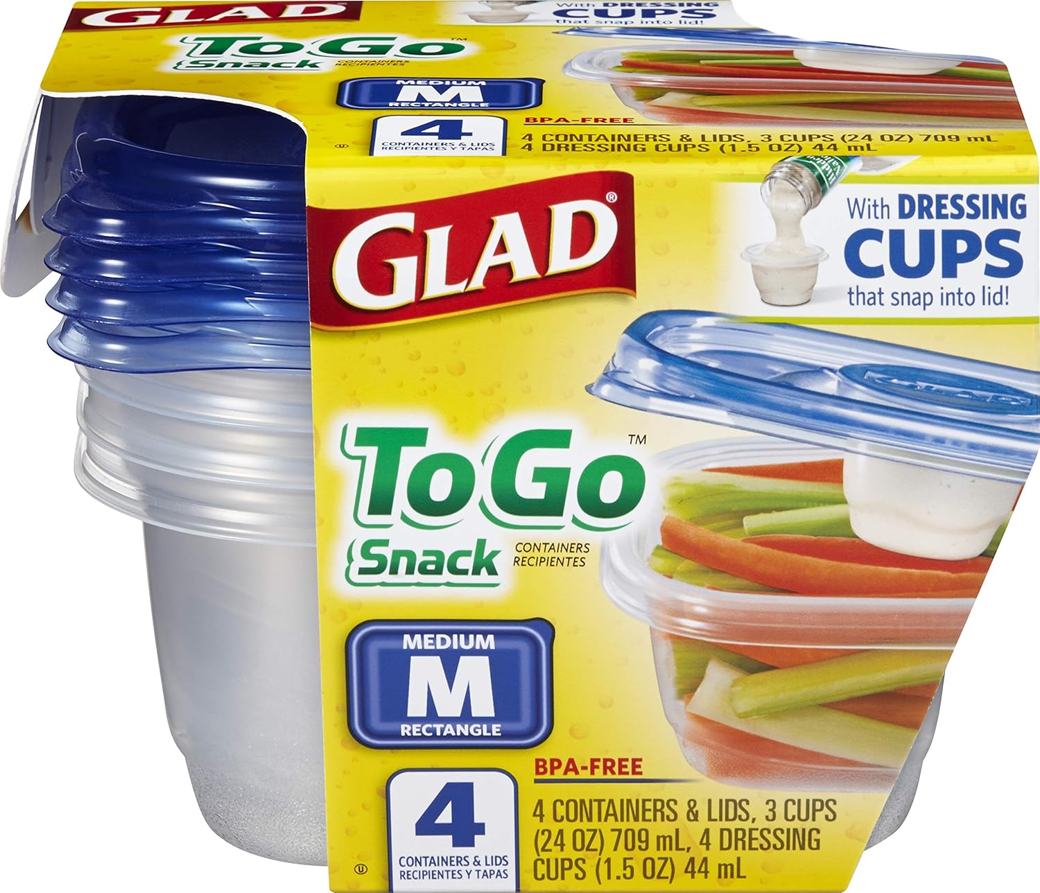 - THE RIGHT SIZE FOR EVERYTHING – GladWare comes in many shapes and sizes to suit your needs. The To Go Snack container can hold 24 ounces of food, making it perfect for a snack of carrots and celery, plus 1. 5 ounces of dressing or dip