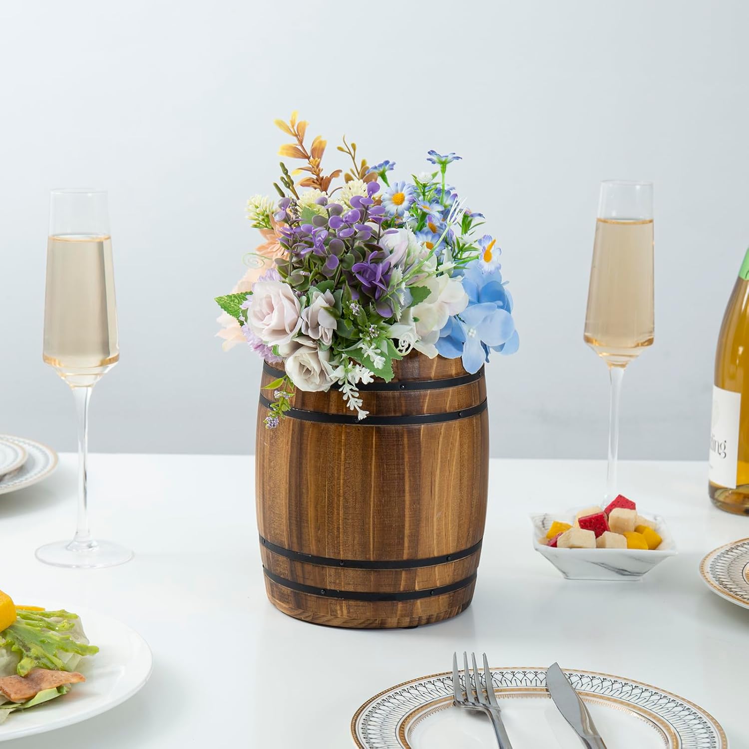 - Rustic wood French style wine barrel utensil crock with dark brown finish and black metal accents
