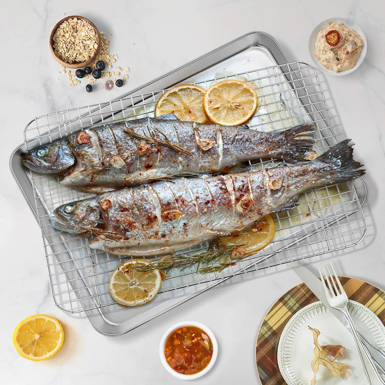 - 【NON-TOXIC & DURABLE】P&P CHEF baking sheet and rack set is made of premium pure stainless steel without any chemical coating or other material, Neither releasing toxic material to food, nor reacting with your meal, Heavy-duty structure can hold heavier food and will be durable for years of use, A better choice than aluminium or coated pans and racks