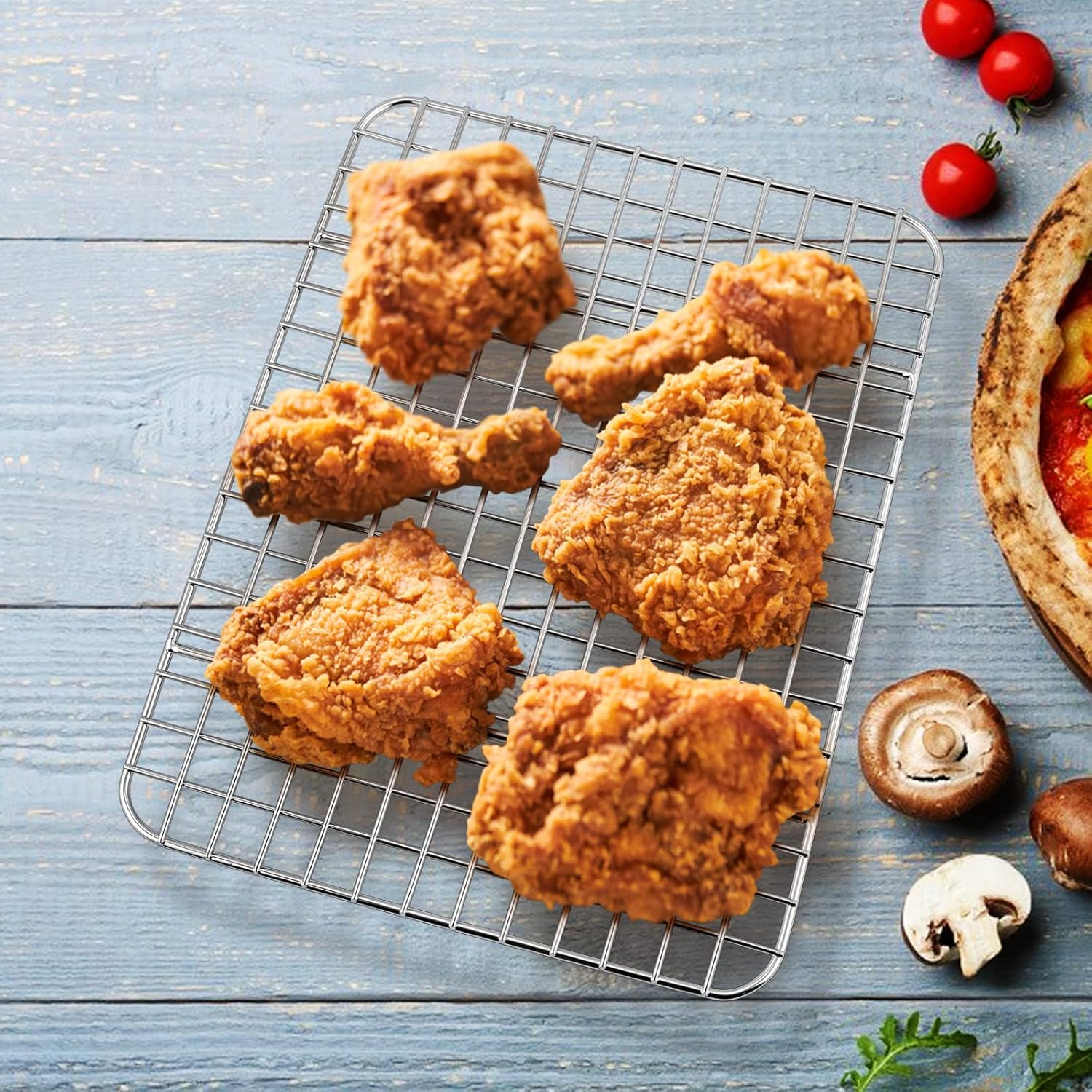 - VERSATILE - Two piece mini racks measures 9.7 inch x 7.3 inch, Make a great insert into a 10.5'' x 8.3'' baking sheet, Perfect for cooling and baking cookies, pizza, cakes and pies, grilling and smoking meats like bacon and chicken wings, roasting vegetables and fries, dripping grease and sauce off the food