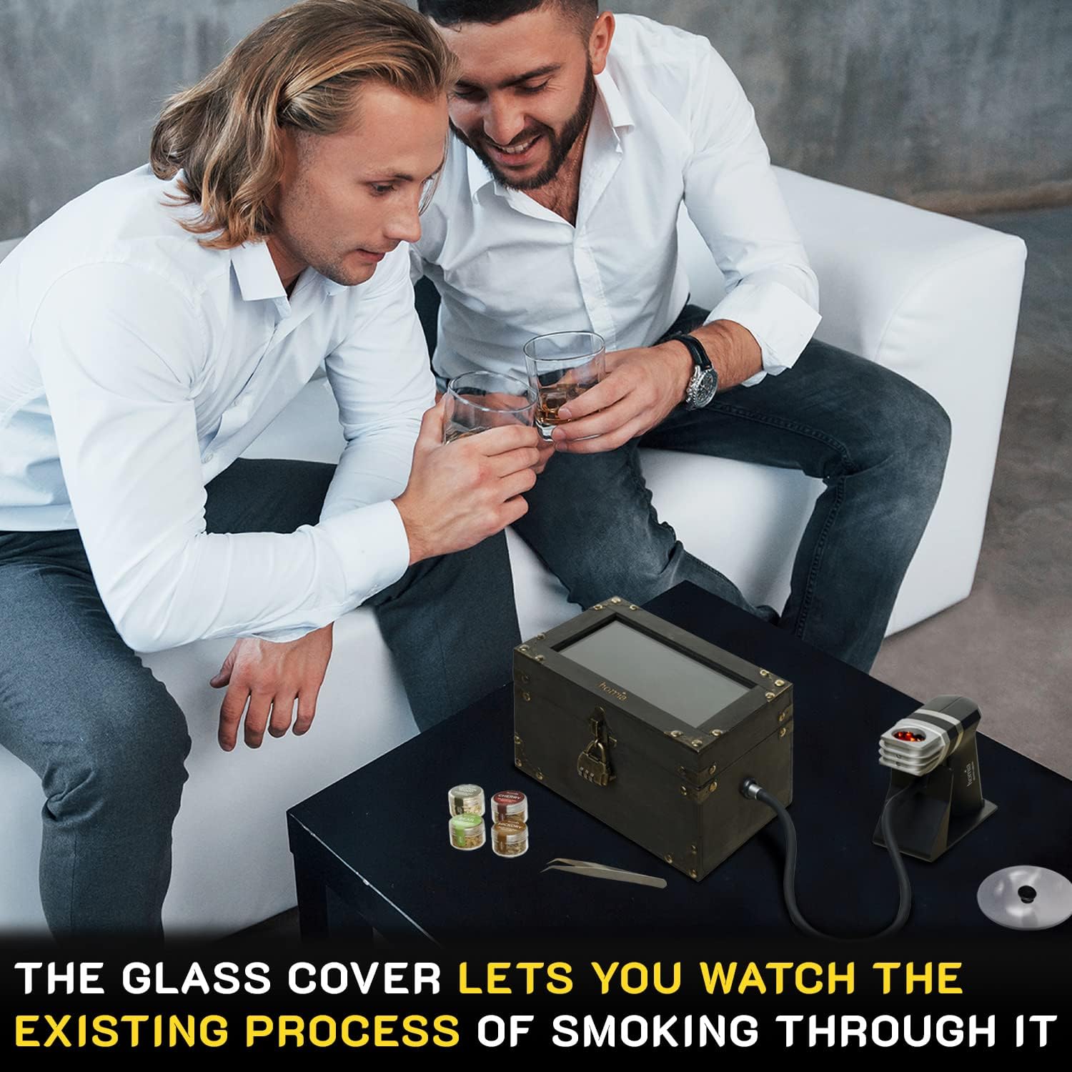 - 🔥 MULTIPURPOSE & GREAT GIFT - Cocktail, Whiskey, Meat, Fish, Cheese - add a smoky flavor to virtually any food or Cocktail. This Cocktail Smoker brings your weekend to new heights and makes you feel like a professional mixologist and chef. It also makes a useful gift for men for any close person in your life. Excellent gift choice for Father`s day and other occasions: Birthday, Father`s Day, Anniversary, Valentine's Day, Thanksgiving, Christmas, etc.