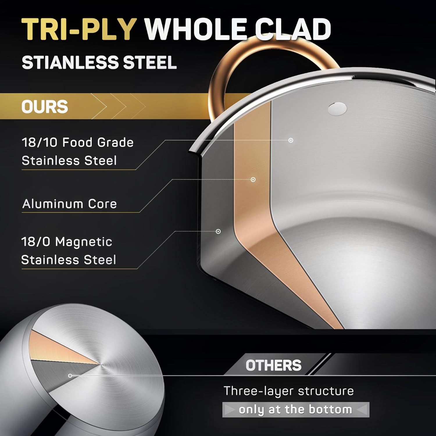 - Heats Up Quickly With Tri-Ply Stainless Steel - The unique whole body tri-ply bonded construction alternates layers of stainless steel and aluminum for maximum durability. This pot heats up quickly and evenly while preventing hot spots, ensuring better food cooking and energy savings.