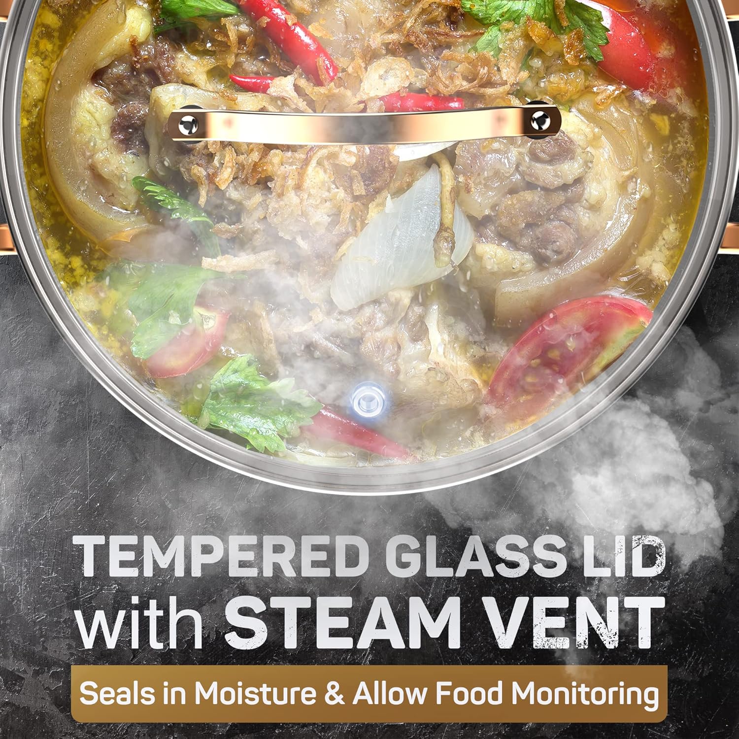 - Comes With Tempered Glass Lid & Upgraded Package - Equipped with a steam vent lid, this elegant pot allows you to effortlessly monitor your cooking while sealing in heat, flavor, and nutrients. Plus, it comes in an upgraded, festive-ready packaging, making it perfect for any special occasion.