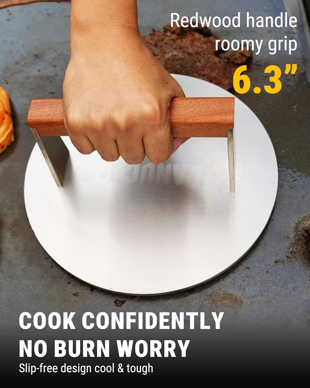 - YOUR BBQ PARTY SIDEKICK: With our 9-inch large food weight press, meats are evenly cooked and served promptly, ensuring your guests enjoy every moment of the party