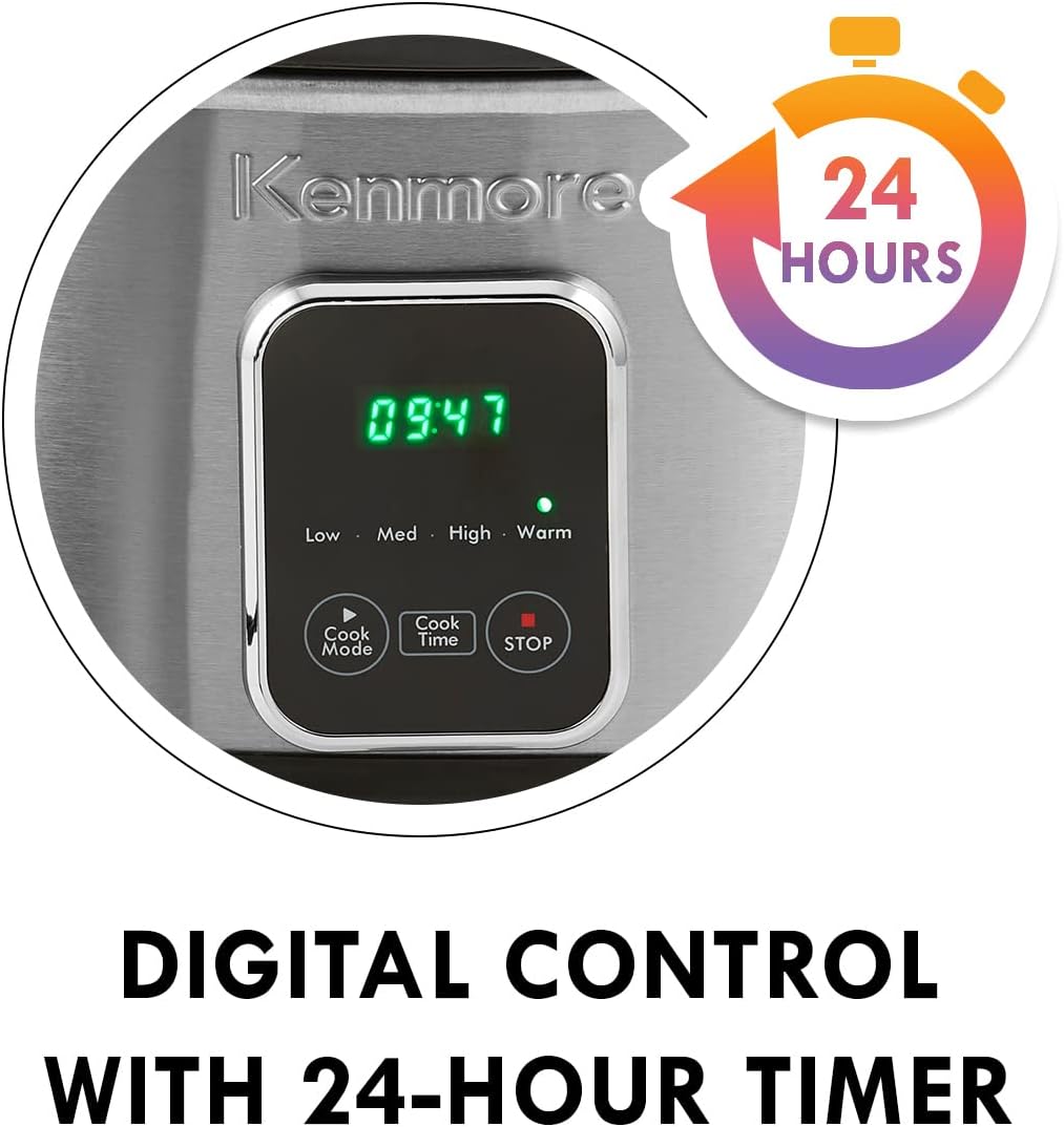 - CONVENIENT AND PROGRAMMABLE - The kenmore 7 quart slow cooker allows you to prepare a delicious home-cooked meal even when you're not at home. simply add your ingredients, set the timer, and come home to a hot meal that's ready when you are. It's perfect for busy families, college students, or anyone who wants to enjoy a hot meal without the hassle of cooking after a long day.