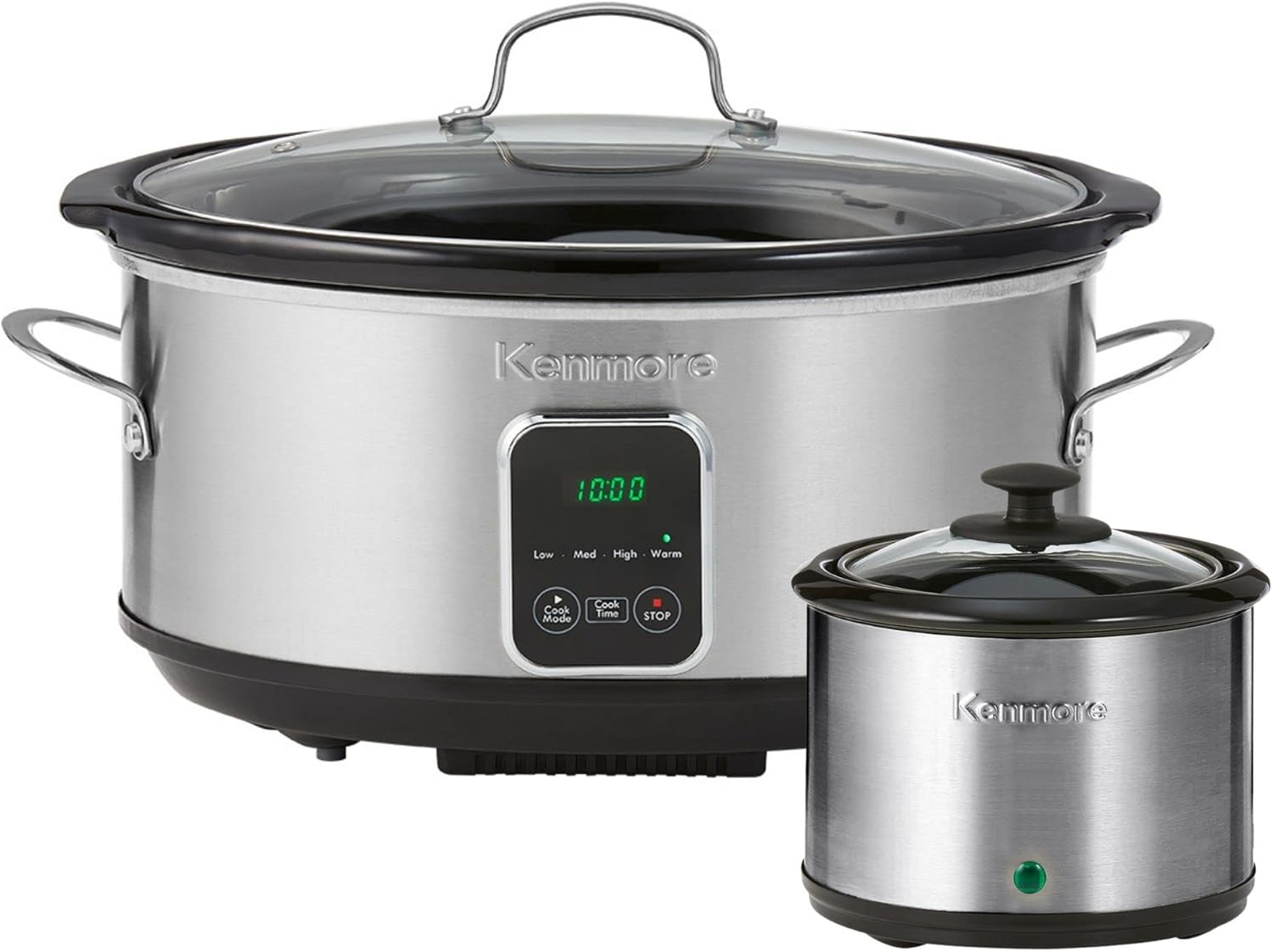 - EFFORTLESS CLEANUP - The contemporary-style black and silver kenmore 7 quart slow cooker and dipper feature stainless steel exteriors and handles that easily wipe down. The removable ceramic inserts and tempered glass lids are dishwasher-safe, making cleanup effortless and convenient.