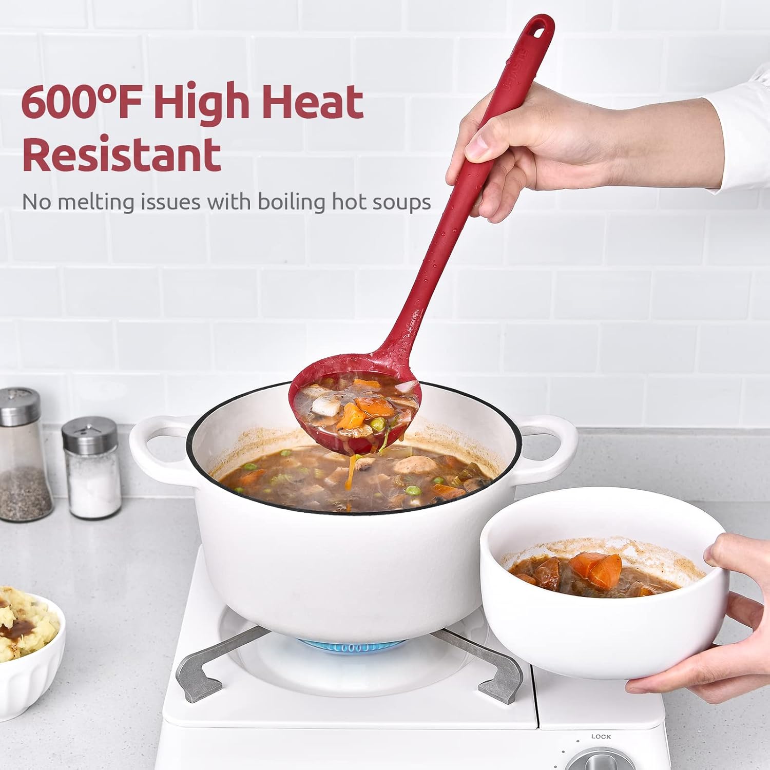 - [600ºF High Heat Resistant] It's made of BPA Free & food grade silicone and handles high heat well. If you forget and leave this kitchen ladle inside a pot of soup while you're eating dinner, it won't melt. You can use this cooking ladle for soups, thick chili, stews, gravy and other foodstuffs and it won't scratch your nonstick pots and pans. Integrated design makes it no small places for food to hide in! Goes through the dishwasher well or it's an easy, quick cleanup in the sink.
