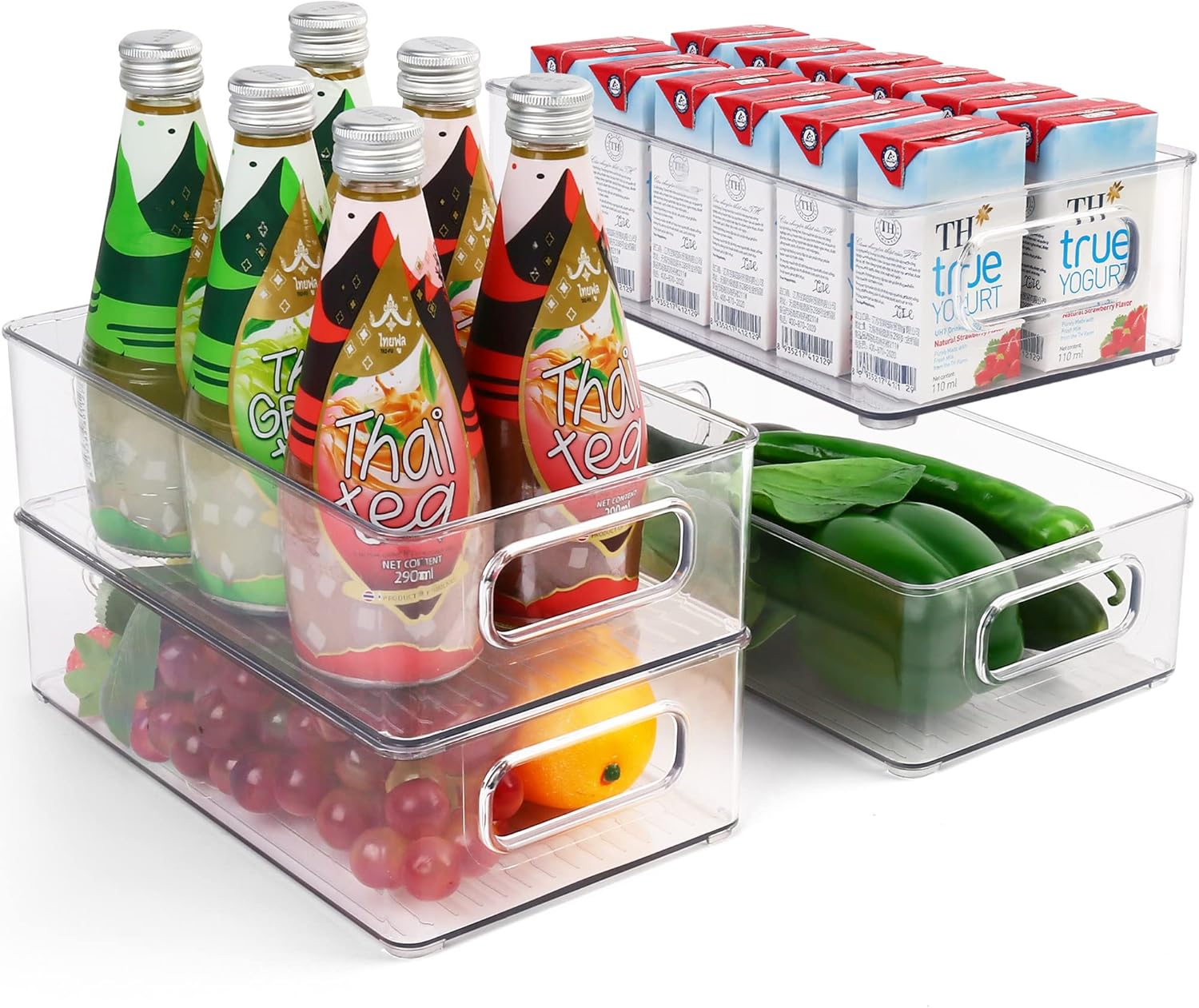 LotFancy Refrigerator Organizer Bins, 4 Pack,10x6x3 in, BPA Free Clear Plastic Storage Bins for Pantry Organization, Stackable Containers with Handles for Fridge, Kitchen Drawer, Freezer, Cabinet