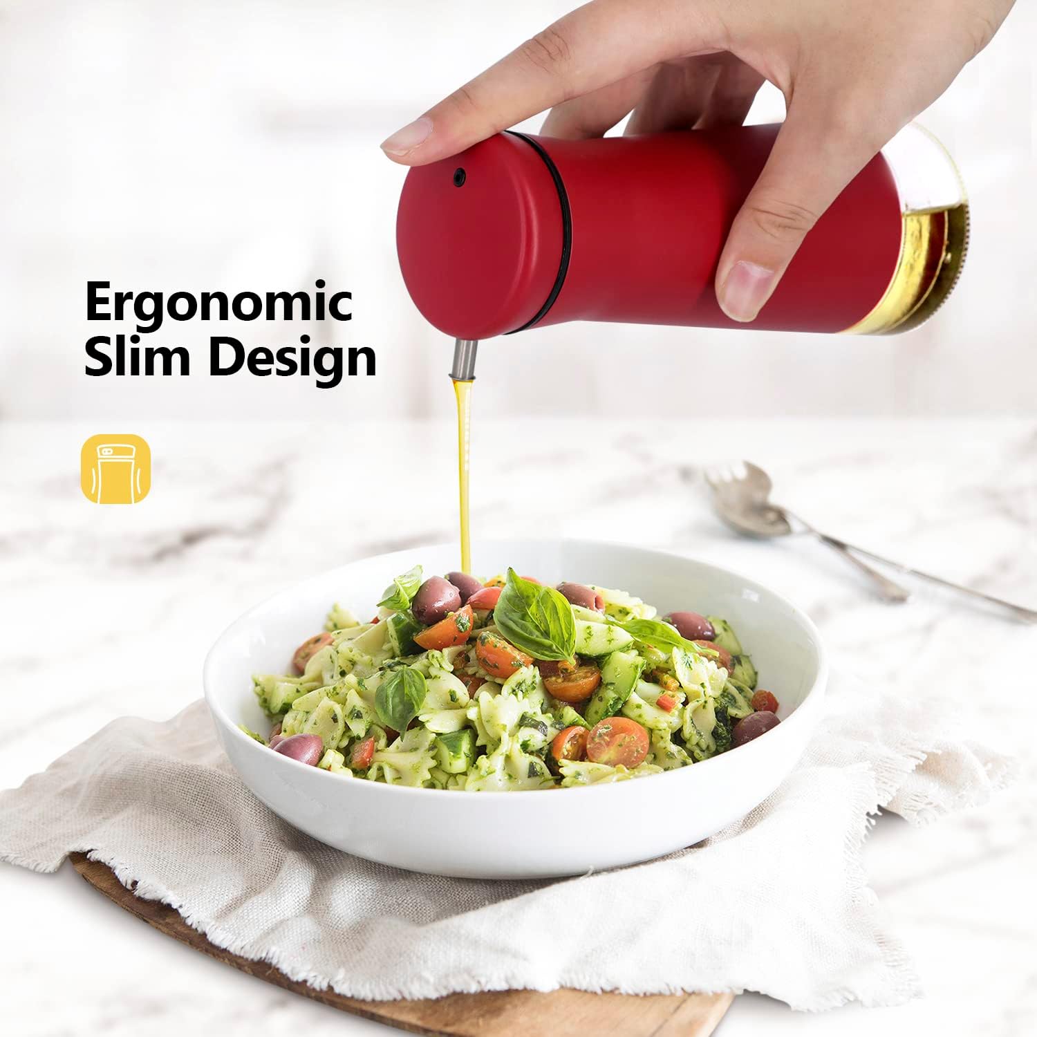 - CLEAN THE OIL CRUET STAINLESS STEEL: Novel design-the olive oil dispenser makes it incredibly easy to add oil or vinegar to any dish! Gently unscrew the stainless steel lid and the shell to rinse with water. No longer worry about oil stains.