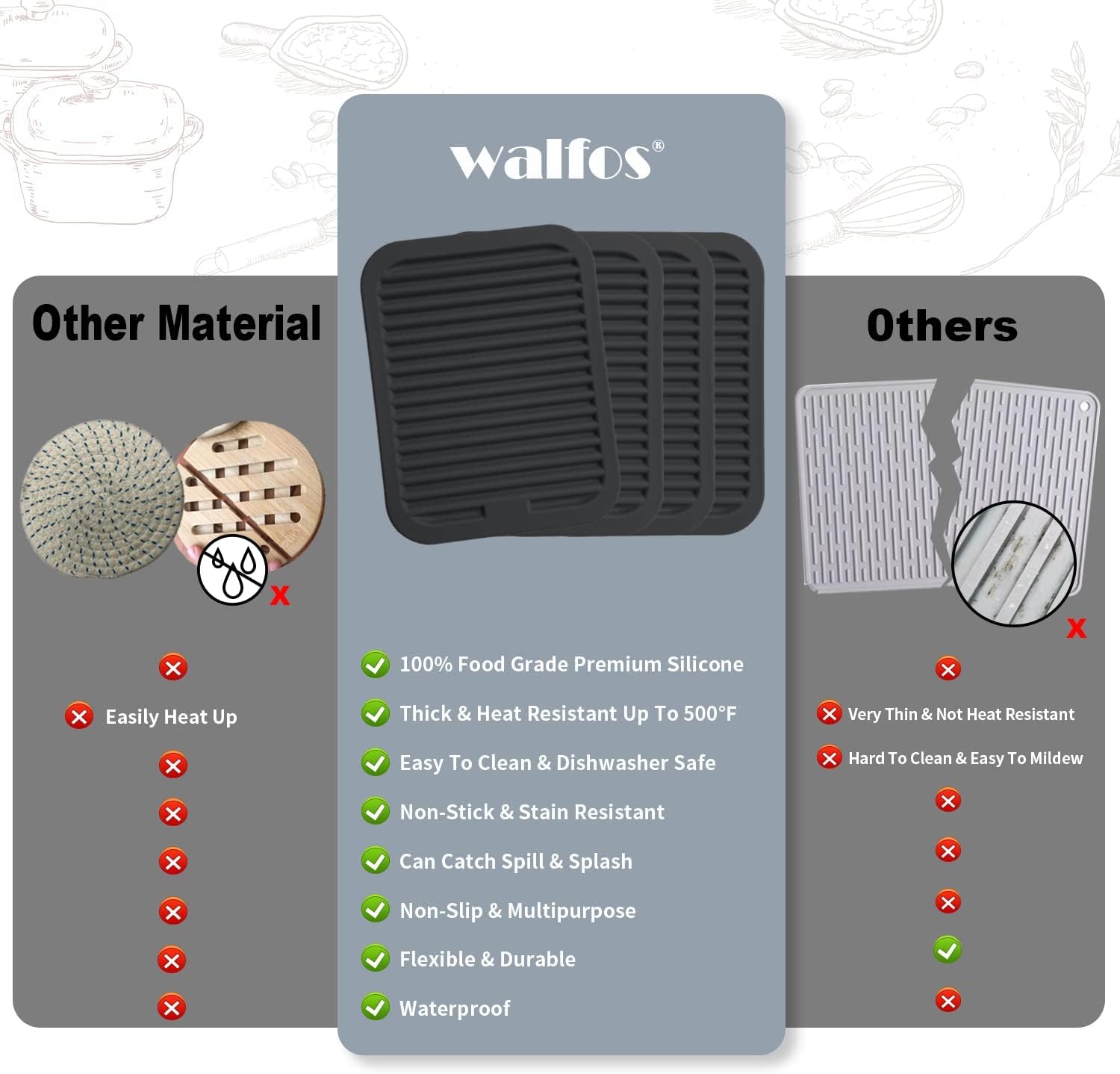 - HEAT RESISTANT: Walfos silicone hot pads for kitchen are heat resistant up to 446°F, Raised wide ridges will separates the hot pot from the table, protect your kitchen countertop from scalding