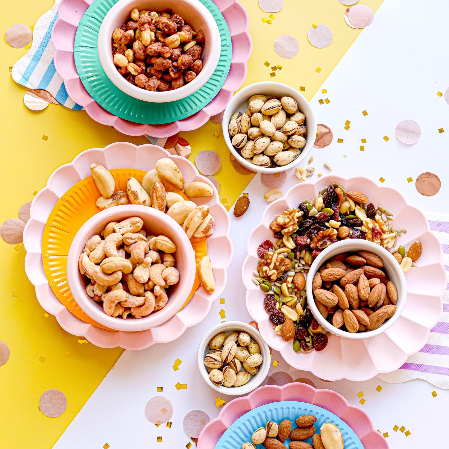- SELECT ASSORTMENT Slip off the ribbon, open the latch, and be dazzled by a gourmet package of Salted Pistachios, Salted Nut Mix, Honey Mustard Pretzel Mix, Spicy Pub Blend, Praline Peanuts and a Cranberry Health Mix.