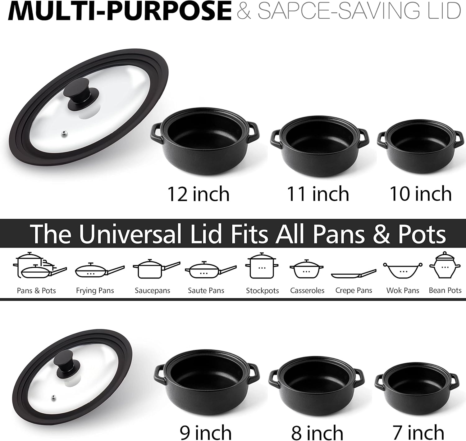 Anaeat Silicone Universal Lid for Pots, Pans and Skillets - Tempered Glass Covered with Heat Resistant Silicone Rim Fits All 7" to 12" Diameter Cookware -Easy to Use Replacement Frying Pan Cover