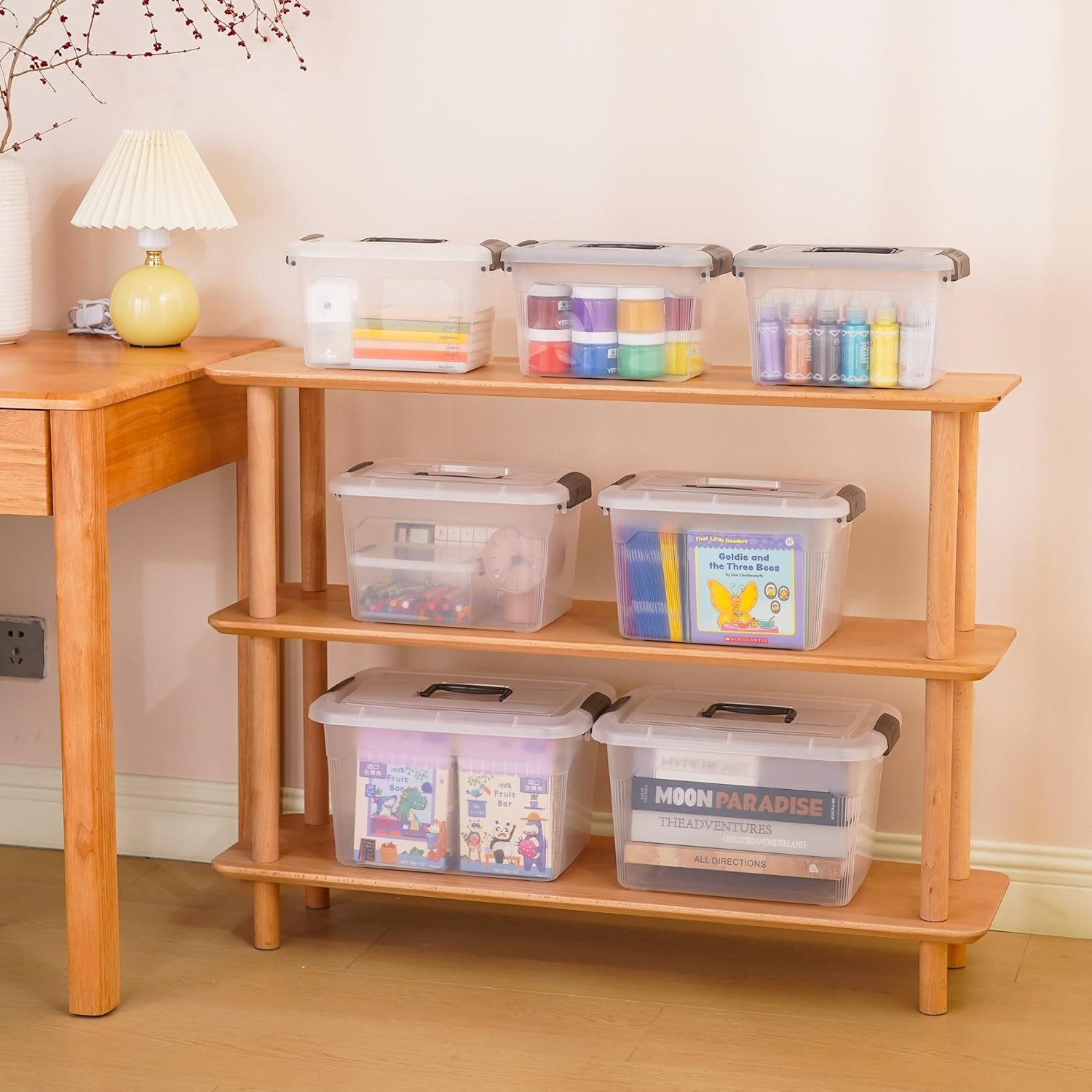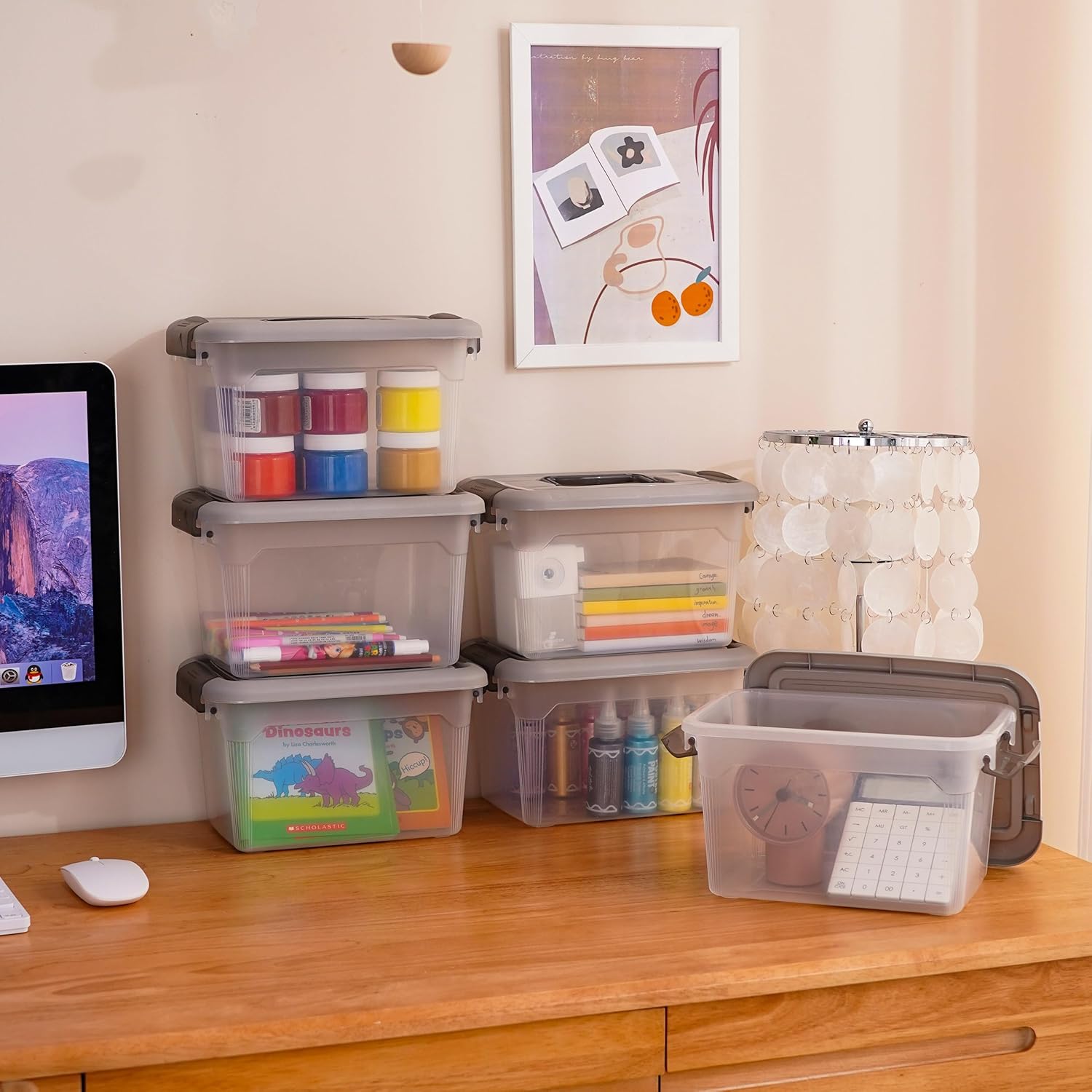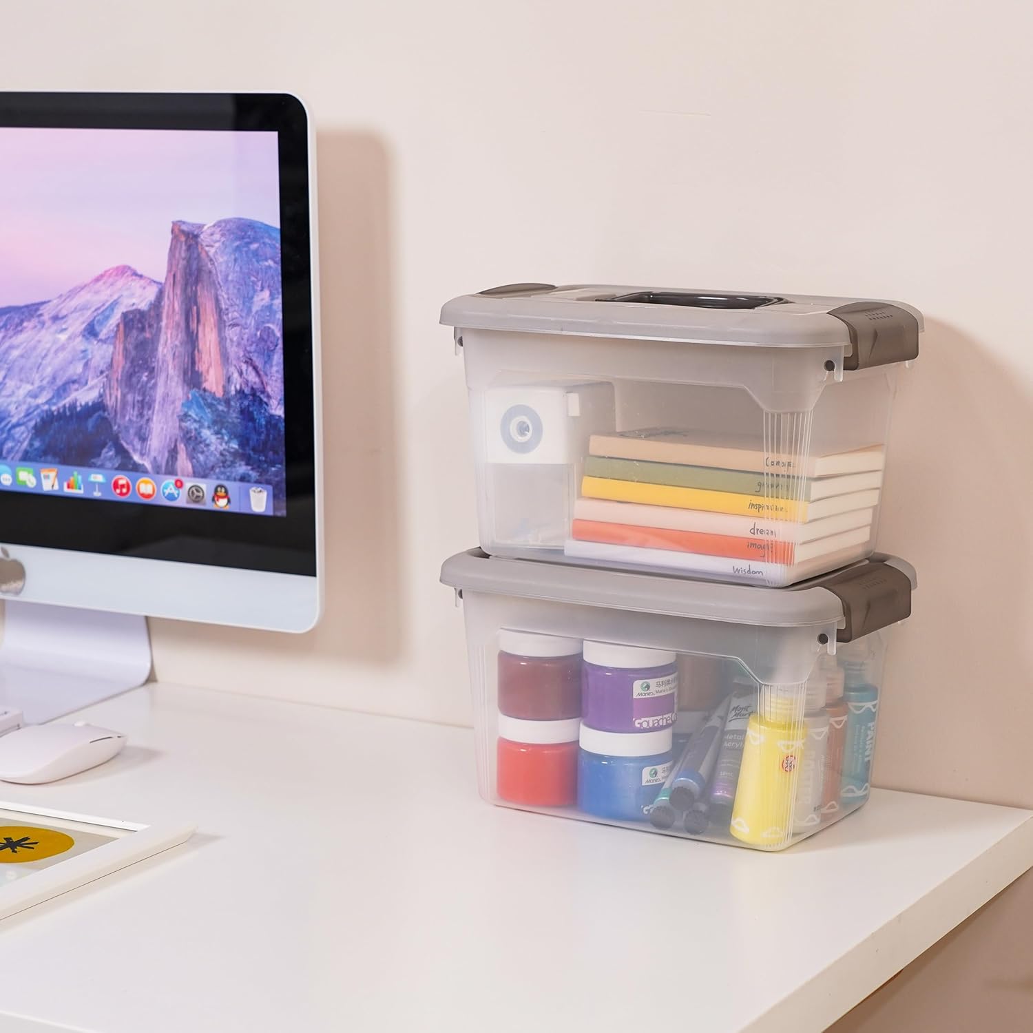 - 【Quantity & Capacity】Including 4 bins for organization. Each box's capacity: 6 quarts. Measurements: 10.9"L*7.7W"*6.5"H.