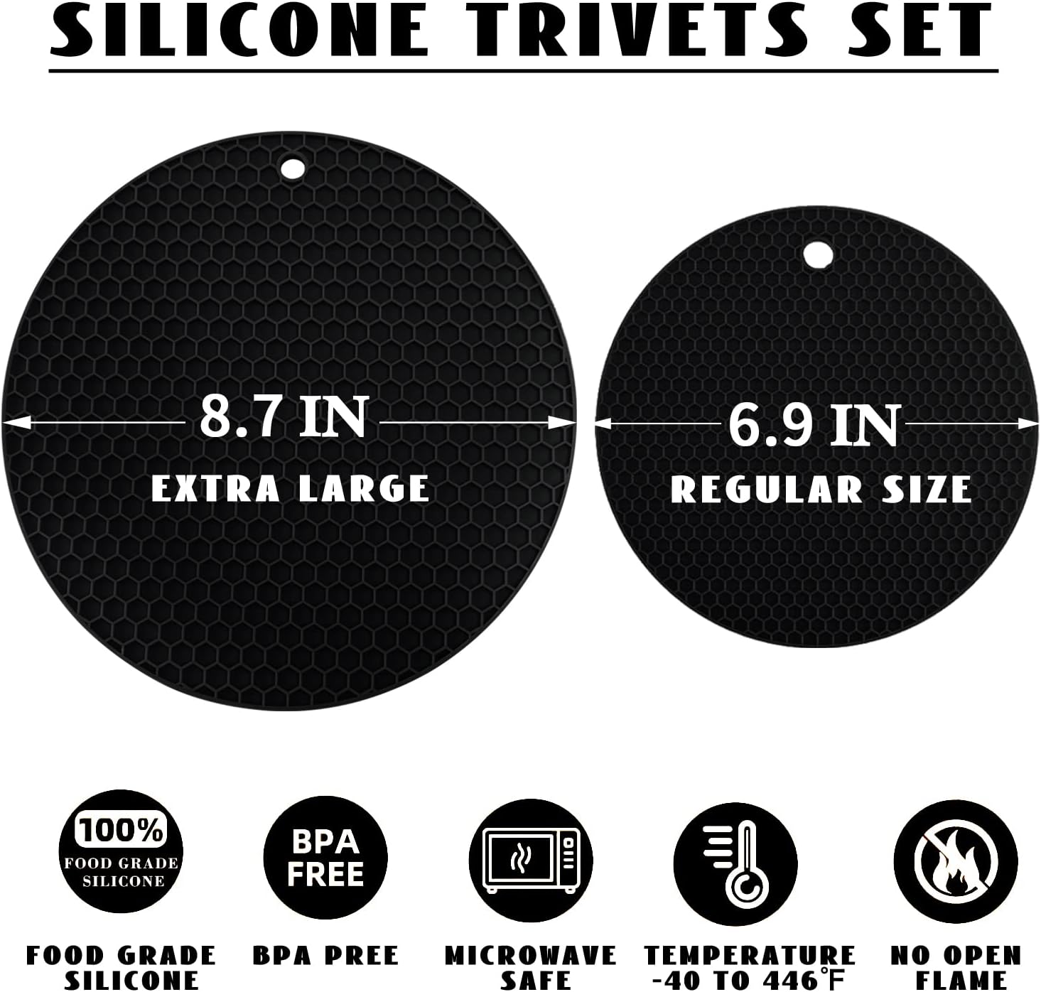 - 🎯EASY TO CARE - The black round silicone mats for the kitchen counter are easy to clean with water or in a dishwasher, cleaning with a brush if needed. Waterproof and naturally non-stick, the small silicone trivet's size is 6.9" x 6.9", the large trivet's size is 8.7" x 8.7", suitable for most bowls and plates.