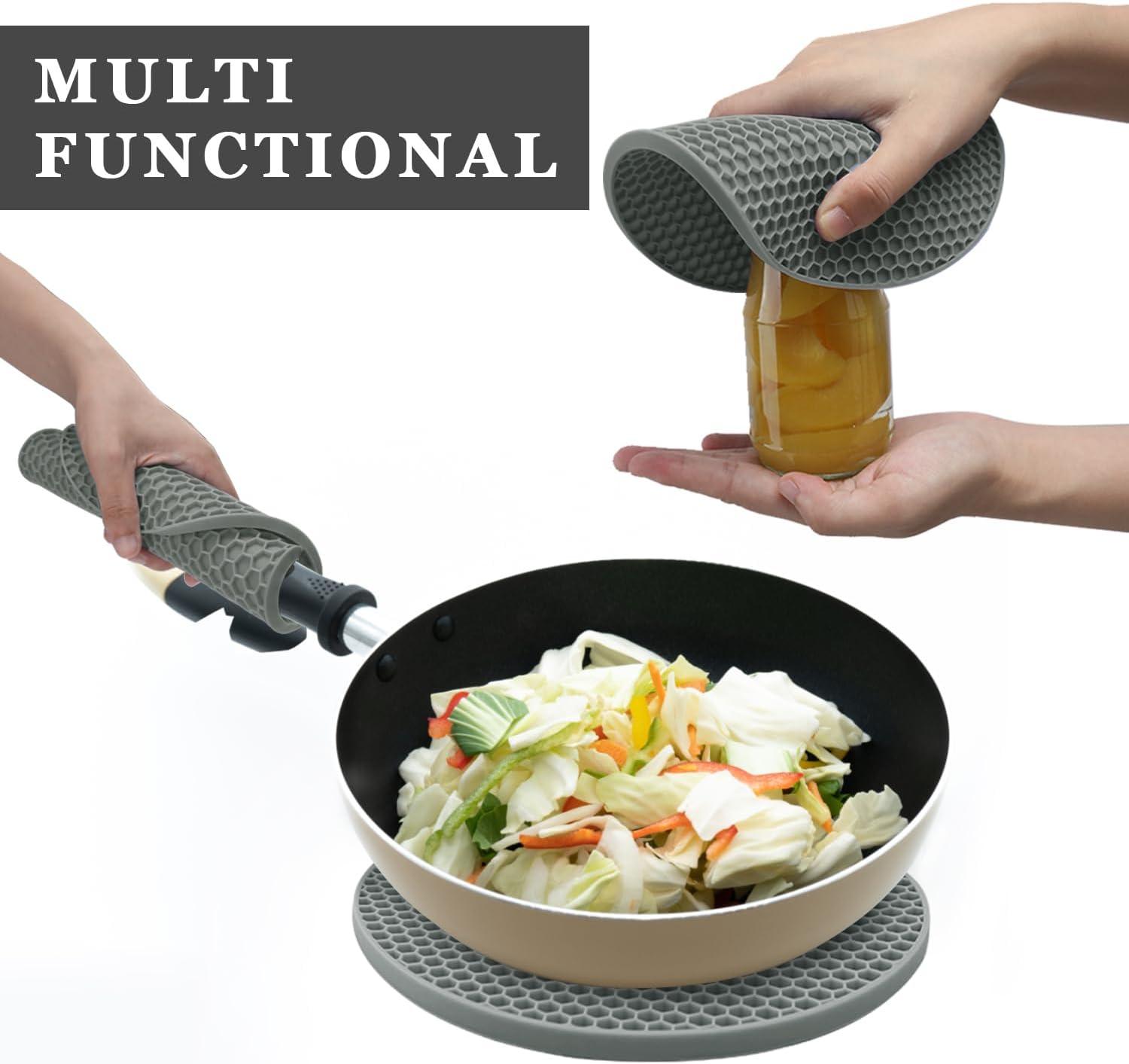 - 【MULTIFUNCTIONAL】The grey round hot plate holder is a practical and versatile addition to the kitchen. One grey round silicone hot pad takes the place of more than four other kitchen tools. We can use the grey round pot holder as a silicone placemat, silicone heat resistant mat, drying mat, microwave bowl mat, jar opener, spoon holder, garlic peeler, coaster, etc. An ideal practical gift for your mom &kitchen enthusiast.