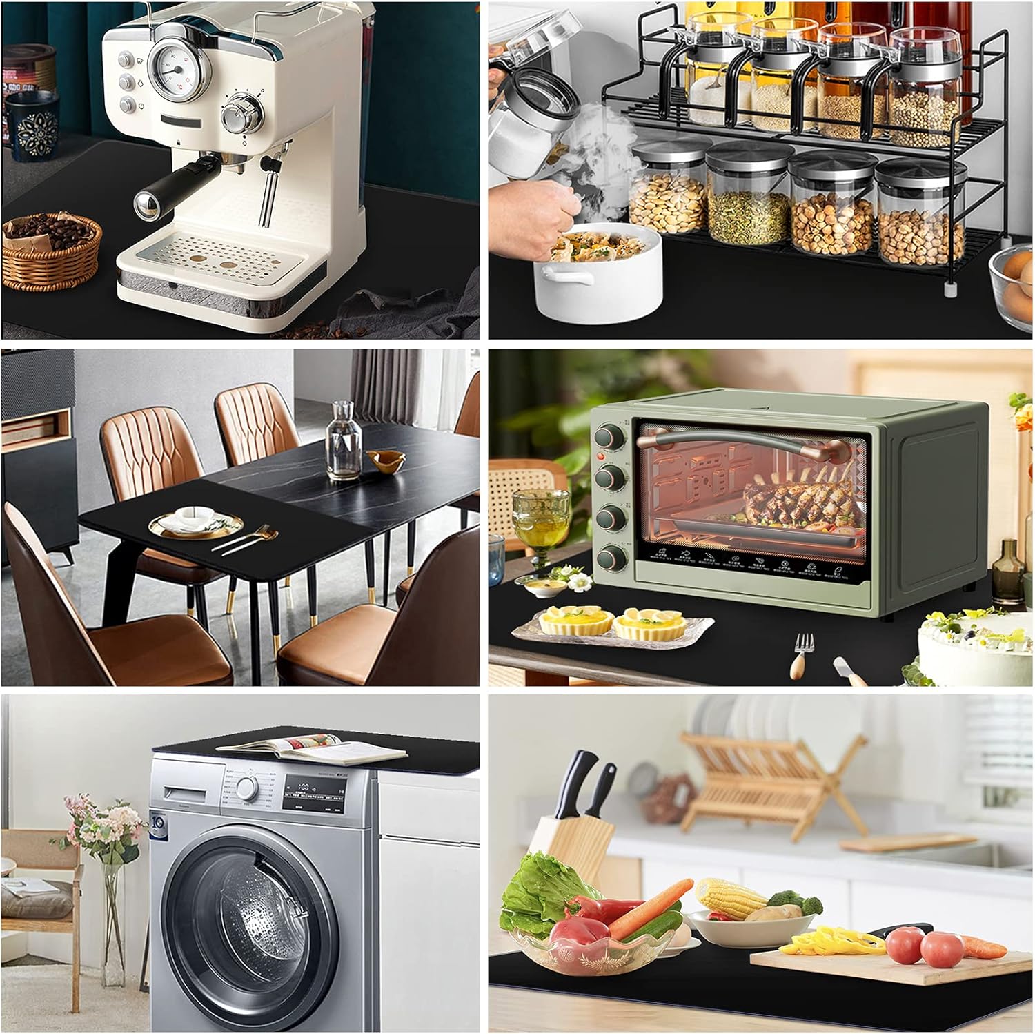 - You Canβt Go Wrong with It: This placemat can solve multiple problems. Great for catching messes. Protect counters from spills, scratches, grease, coffee stains, or damage. Place hot items of all sizes directly on the mat without having to dig through the drawer for a hot pad and no more need for trivets. Reduce the noises made by appliances. No need to worry about items slipping off the countertop. Tools will keep in place. Even if you are rolling dough hard on it, the mat won't slide