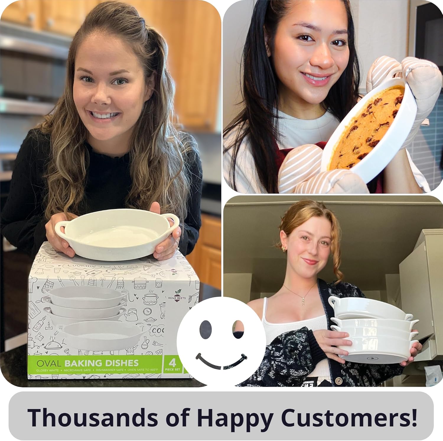 Oval Au Gratin Baking Dishes for Oven Safe and Microwave Cooking and Baking, 4 Pc. Set, Heat Resistant Ceramic with Handles for Serving, Small Mini Casserole Dish, 8" x 5", 16 oz, White