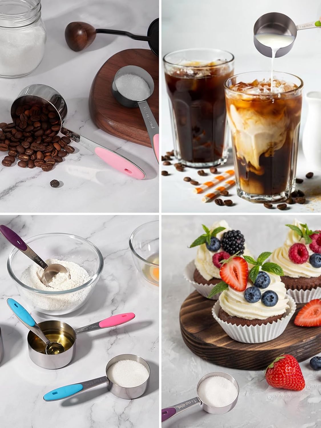 - Professional Kitchen Measuring Set: Joyhill metal measuring cups and spoons set have ten different capacities, each engraved precise measuring accurate in US and metric units of 1 Cup 250 ml, 1/2 Cup 125 ml, 1/3 Cup 80 ml, 1/4 Cup 60 ml, 1/8 Cup 30ml; 1 Tbsp 15 ml, 1/2 Tbsp 7.5 ml, 1 Tsp 5 ml, 1/2 Tsp 2.5 ml, 1/4 Tsp 1.25 ml, which will help you reduce any measuring errors for cooking, baking or coffee, get delicious food