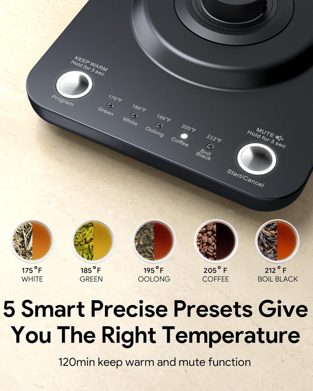 - 5 Smart Temperature Preset - The preset are 212-205-195-185-175°F, suitable for Black tea, Coffee, Oolong, Green tea, White tea, etc. Various temperature presets to meet different needs. The accurate variable presets allow you to never again burn your coffee or tea leaves.