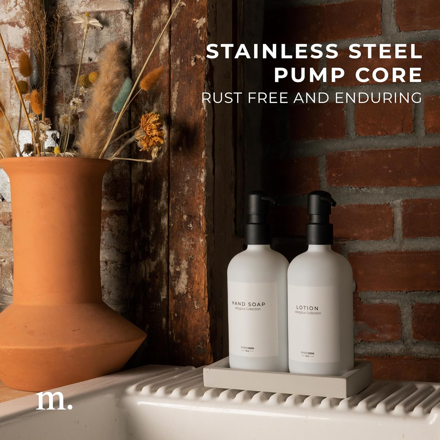 - This Pack Includes: Two white glass soap dispensers with black stainless steel pumps, which can hold 16.9 fl oz/500 ml, a concrete tray, and durable waterproof labels (hand soap, sanitizer, dish soap, lotion), ensuring both style and practicality for your bathroom sink.