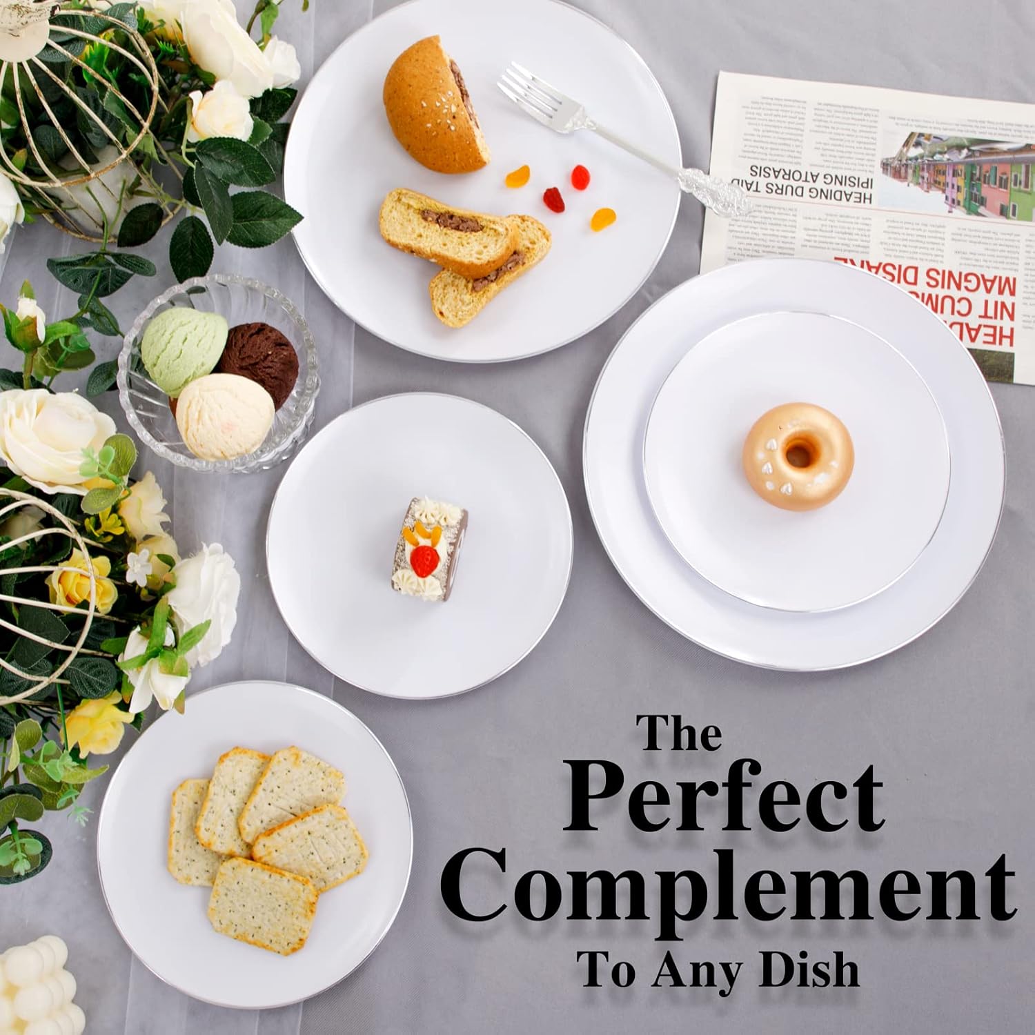 KIRE 100PCS Silver Plastic Plates - Heavy Duty White Disposable Plates with Silver Rim for Party/Wedding - Include 50Pcs 10.25inch Dinner Plates and 50Pcs 7.5inch Dessert Plates
